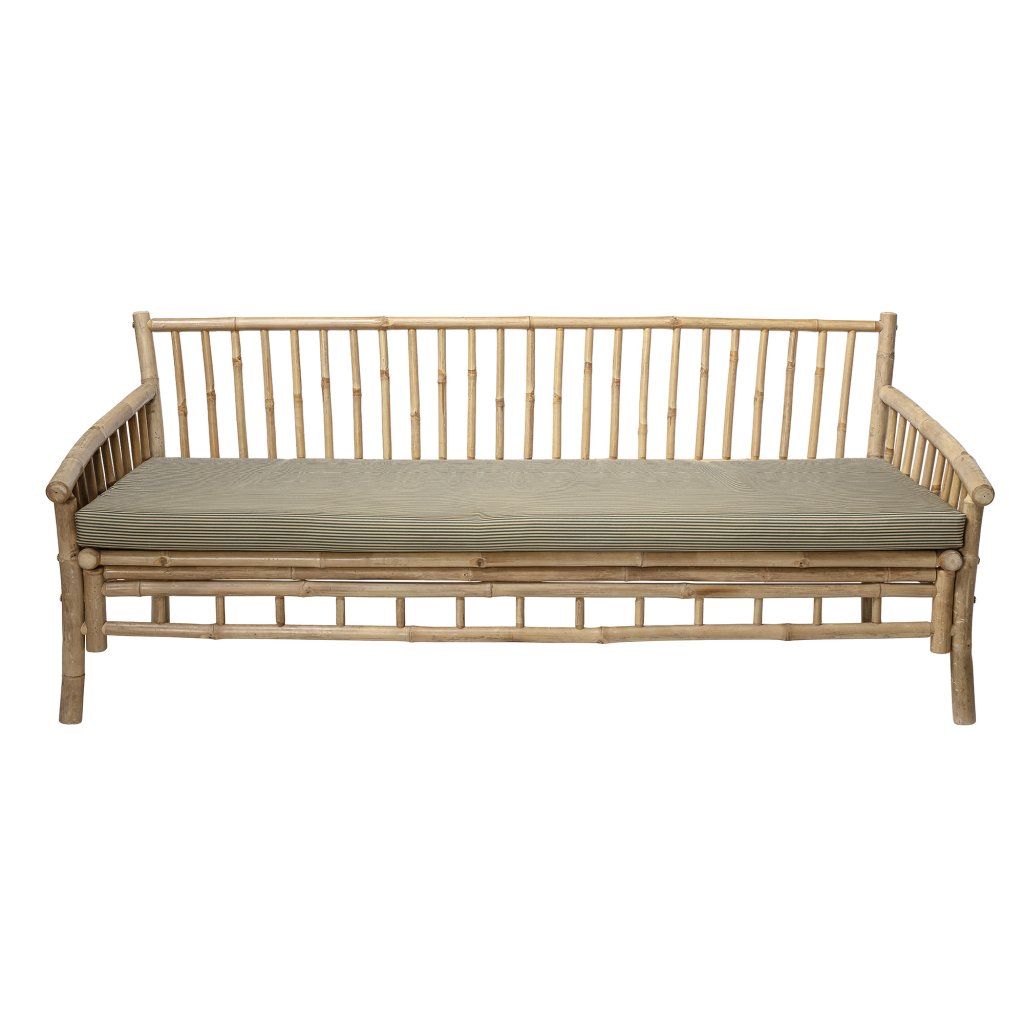 Štýlová záhradná pohovka SOLE od dánskeho výrobcu nádherného nábytku BLOOMINGVILLE. Pohovka je kompletné vyrobená z bambusového dreva a pôsobí tak veľmi exoticky a rustikálne. 4 nohy prechádzajú v sedací priestor a opierku a 2 područky, všetko z tenkých kmeňov bambusového dreva. Pre väčší komfort pri sedení je dodávaný zelený podsedač. Môžete použiť aj vnútri aj vonku. Ideálny nielen do interiérov v boho štýle alebo inšpirovaný exotikou. Krásne doplníte podobne ladeným stolom alebo nábytkom zo rovnakej rady bambusového vonkajšieho nábytku SOLE.