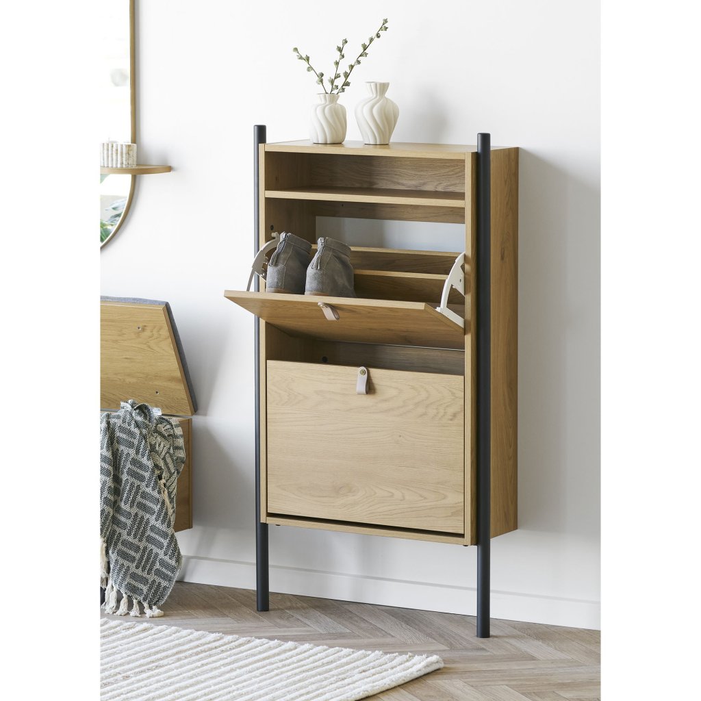 Dizajnový botník BARCO od dánskeho výrobcu nádherného nábytku HOUSE NORDIC. BARCO je praktickým a vizuálne atraktívnym riešením pre organizáciu obuvi v každej predsieni alebo chodbe. Kombinuje funkčnosť, čistý dizajn a prírodný vzhľad duba, ktorý sa ľahko začlení do rôznych typov interiérov. Konštrukcia je vyrobená z pevnej ocele a drevotriesky s povrchom z melamínovej fólie v dekore duba, ktorý je odolný voči každodennému používaniu a zároveň sa ľahko udržuje. Odporúčame kombinovať s doplnkami v čiernej farbe, neutrálnych tónoch alebo s prírodnými materiálmi pre harmonický a jednotný vzhľad vstupného priestoru.