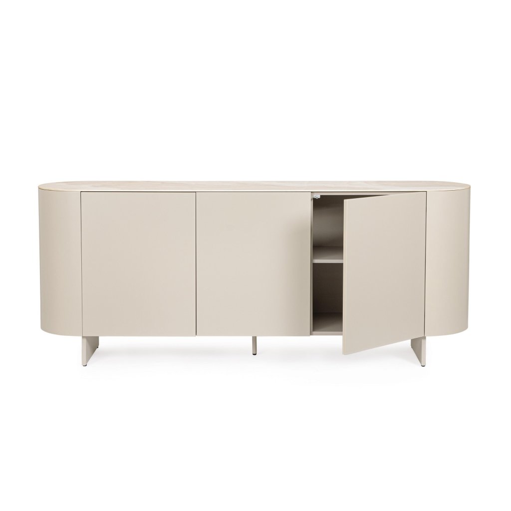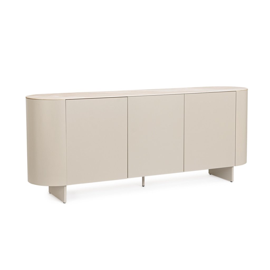 Dizajnová komoda ADRYSA od talianskej firmy štýlového nábytku BIZZOTTO. Komoda ADRYSA je vyrobená z kovu a mdf dosky v krásnom béžovom odtieni. Komoda má tri bočné do strany otvárajúce sa dvierka, za ktorými sa skrýva úložný priestor políc. Vrchná doska je z keramiky v krásnom efekte kameňa ONXY.