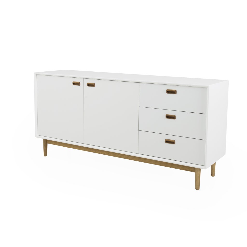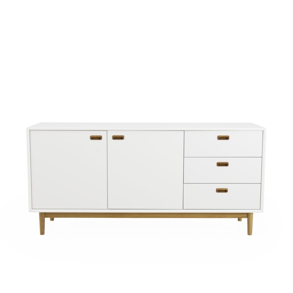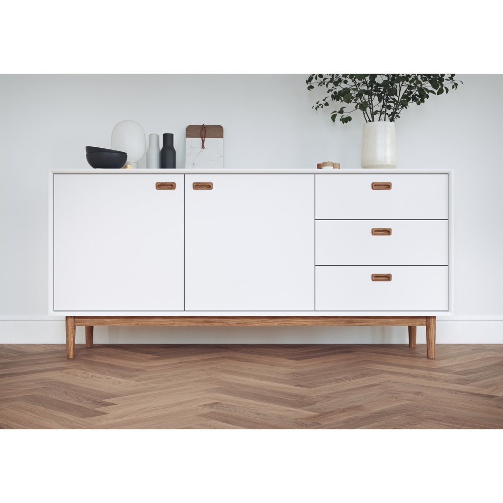 Štýlová a drevená komoda SVEA od švédskeho výrobcu unikátneho nábytku TENZO. Jednoduchý, minimalistický, ale krásny vzhľad radu SVEA, z ktorého vychádza táto komoda. Je vyrobená z bielo lakovanej mdf drevovláknitej dosky, podstavec, nohy a štýlové úchyty sú z masívneho dubového dreva. Komoda s dĺžkou 170 cm má 2 dvierka s otváraním do strán a 3 výsuvné zásuvky . Ponúka veľký priestor na uloženie všetkého potrebného. Celý rad SVEA využíva vysokokvalitný cestovný systém s tichým a pomalým chodom. Komoda je k dispozícii aj v menších alebo väčších rozmeroch a v zelenej farbe. Celá komoda je vyrobená vo Švédsku.