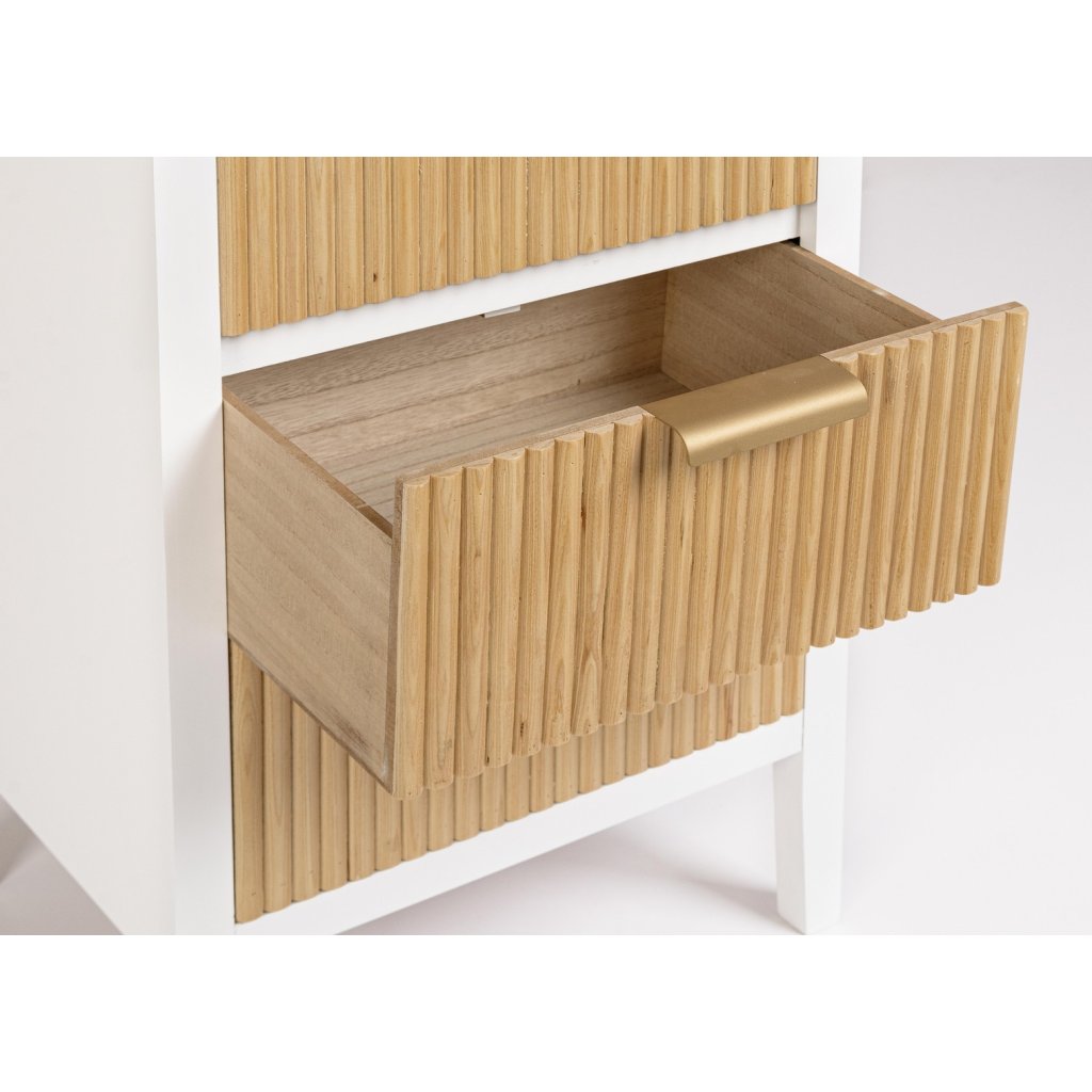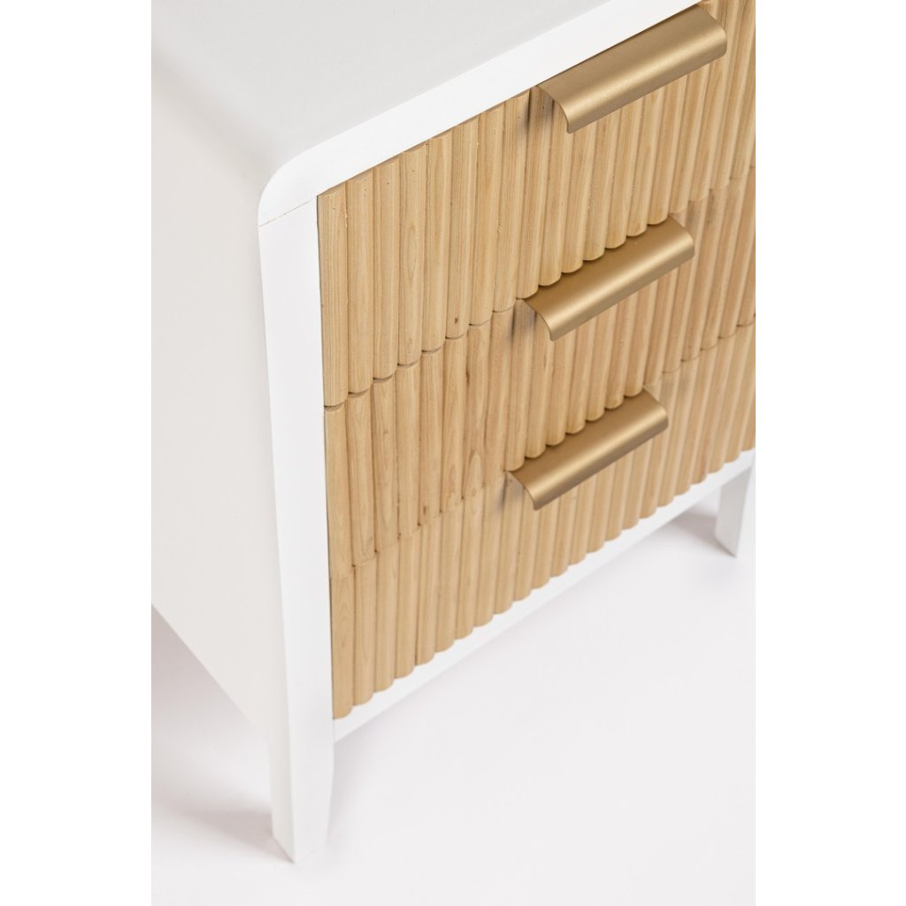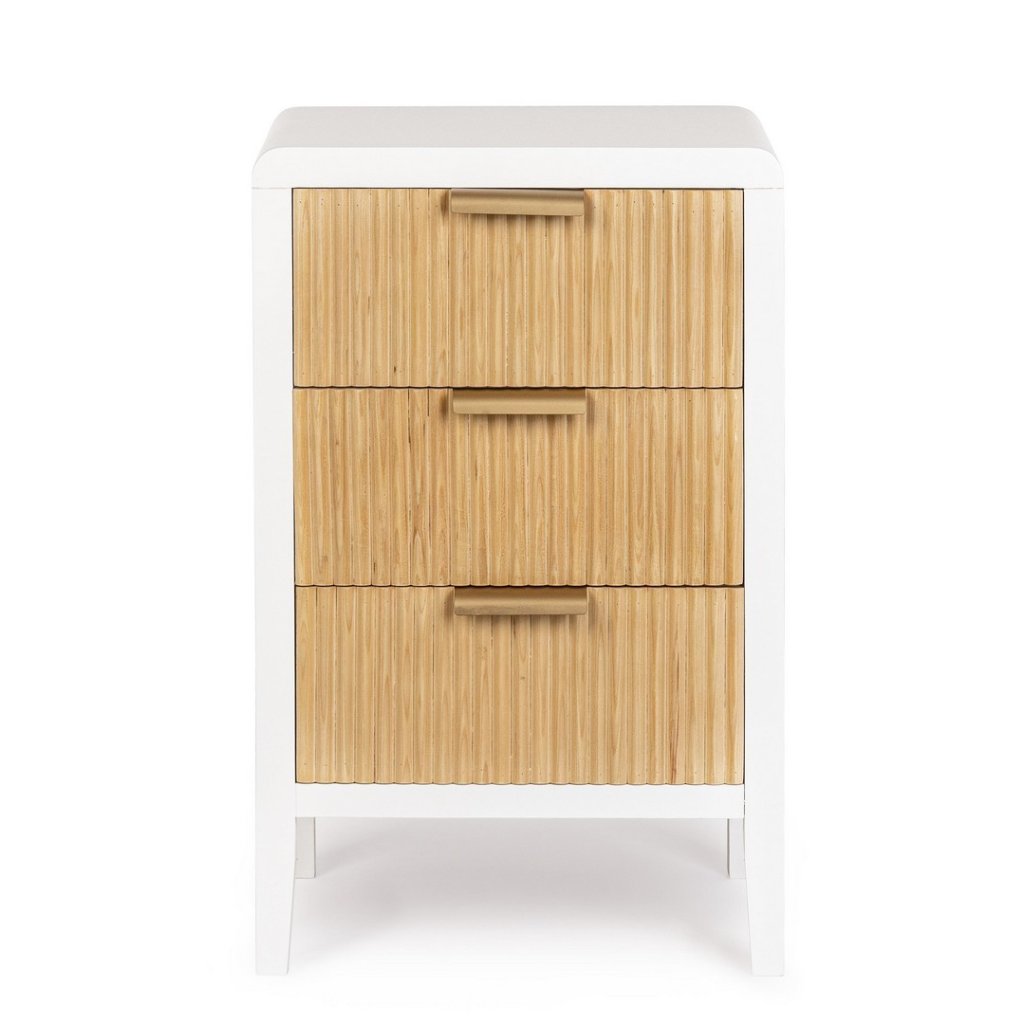 Dizajnový nočný stolík CHARLEY od talianskej firmy štýlového nábytku BIZZOTTO. Stolík CHARLEY je vyrobený z mdf dosky v bielom prevedení s 3 zásuvkami z prírodného dreva paulovnie, ktoré sú zdobené vyrezávanými vertikálnymi líniami s kovovými úchytmi v zlatej farbe. Veľmi elegantný nočný stolík si naozaj zamilujete.