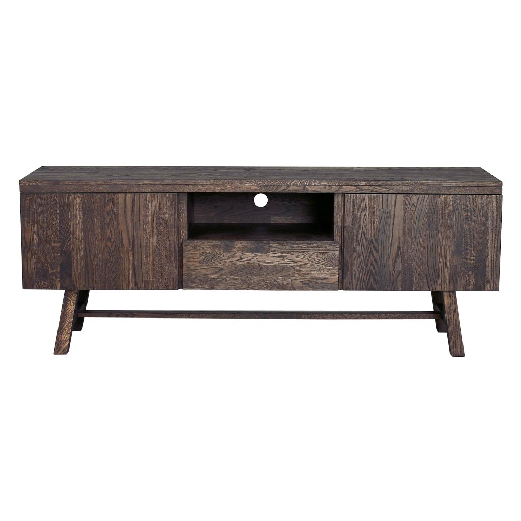 Designový TV stolík BROOKLYN od švédskeho výrobcu kvalitného dreveného nábytku ROWICO. BROOKLYN je kompletné vyrobený z masívneho dubového dreva v tmavom prevedení s transparentným lakom, ktorý chráni povrch pred vlhkosťou a nečistotami. TV stolík tvoria 4 masívne nohy a samotné telo stolíka. Vľavo a vpravo má do strany manipulovateľné dvere, ktoré zakrývajú poličky pre uloženie nosičov alebo spotrebičov, uprostred vysúvaciu zásuvku a prázdny priestor pre uloženie settopboxu alebo ovládačov. Drevo sa pýši certifikátom FSC, čo znamená ekologickú a k prirode šetrnú ťažbu dreva.