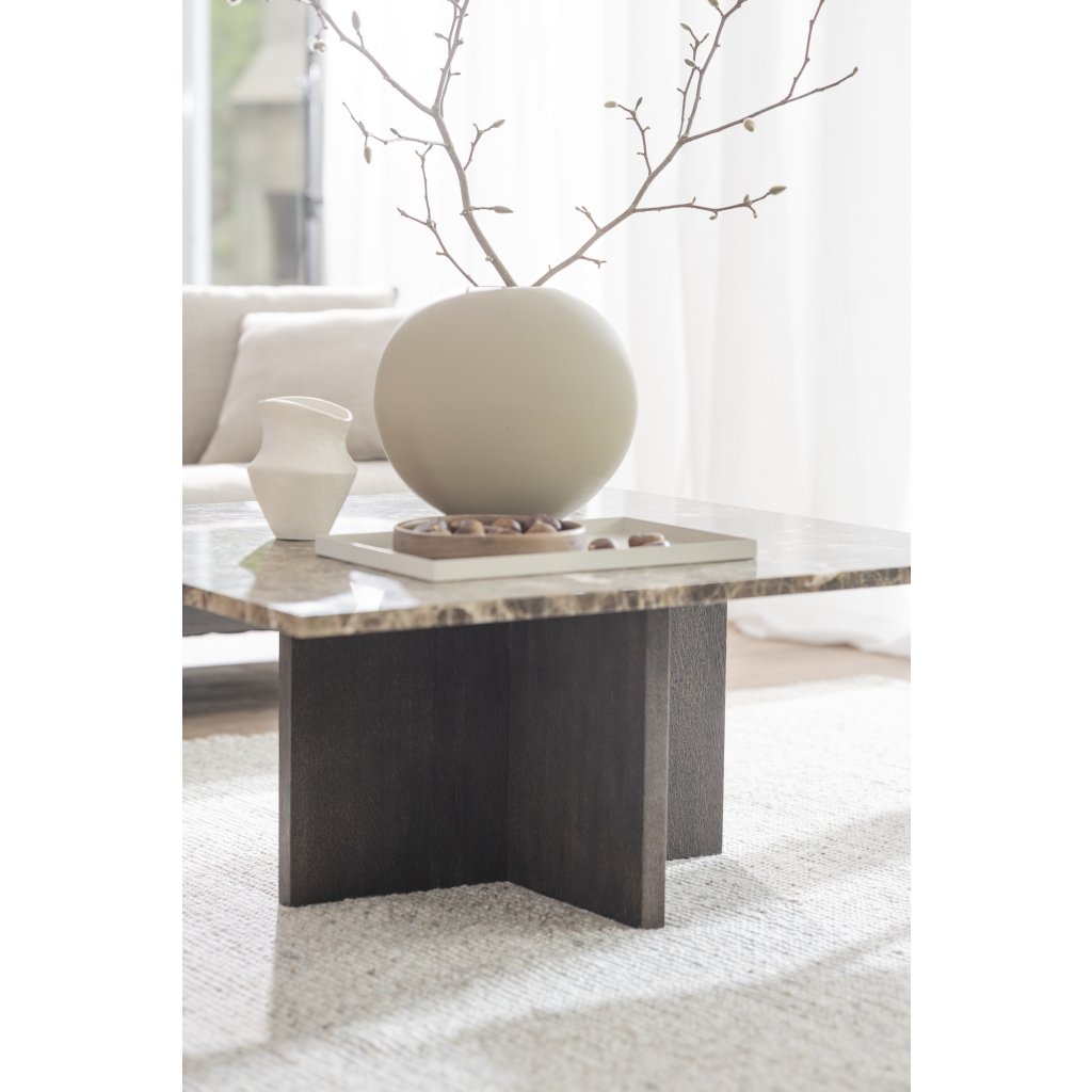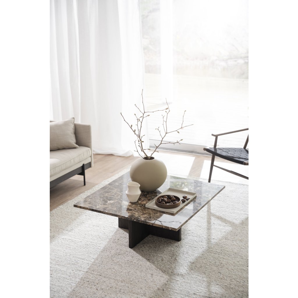 Dizajnový konferenčný stolík BROOKSVILLE od švédskeho výrobcu kvalitného dreveného nábytku ROWICO. Tento nádherný stolík, zástupca JAPANDI štýlu, kombinuje vrchnú dosku z hnedého mramoru Emperador s rozmermi 90x90 cm a spodné nohy, ktoré tvoria 2 dosky prepojené do X z dosiek z lakovanej hnedej dubovej dyhy a certifikátom FSC, čo značí ekologicky získané ak prírode šetrné drevo. Vskutku luxusný konferenčný stolík pre dokonalú obývaciu izbu. V dostaní aj v ďalších farebných variantoch.