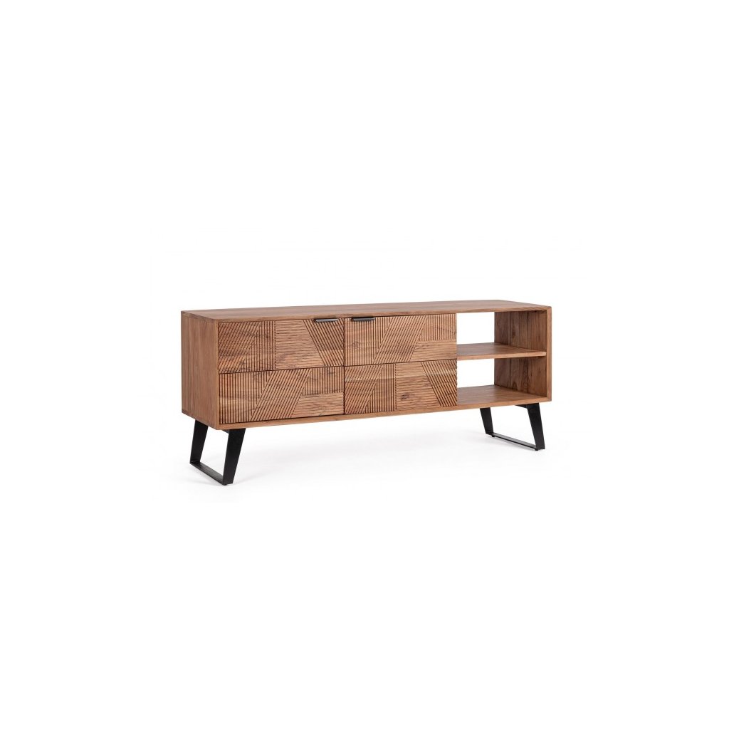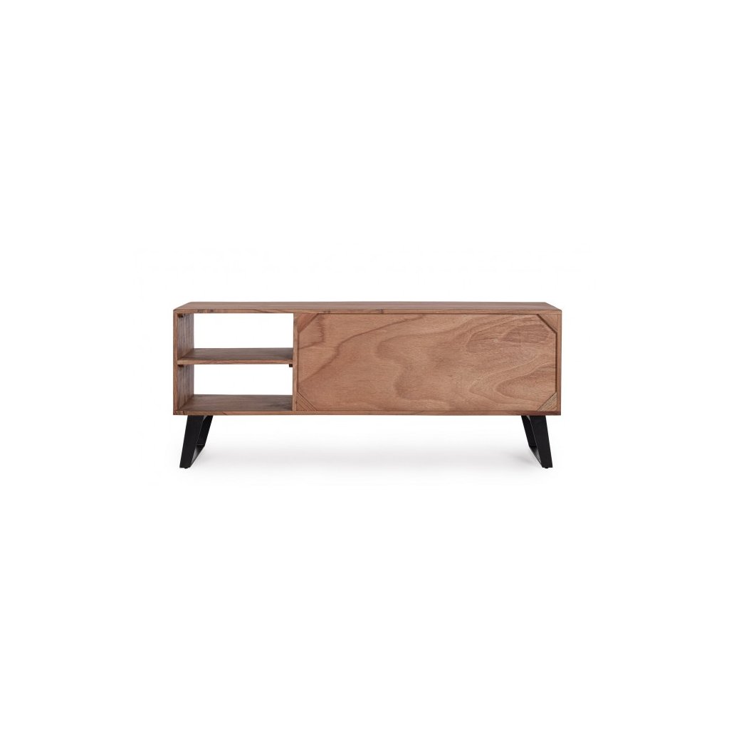 Dizajnový TV stolík ISAR od talianskeho výrobcu štýlového nábytku BIZZOTTO. Televízny stolík pozostáva z oceľových nôh, ktoré mu dodávajú veľkú stabilitu. Konštrukcia je vyrobená z agátového dreva. Zadná časť stola je vyrobená z preglejky. Dvoje intarzované otváracie dvierka sú vyrobené ručne. ISAR má aj dve otvorené police. To ponúka dostatok úložného priestoru. Stôl je povrchovo upravený ochranným akrylovým náterom.