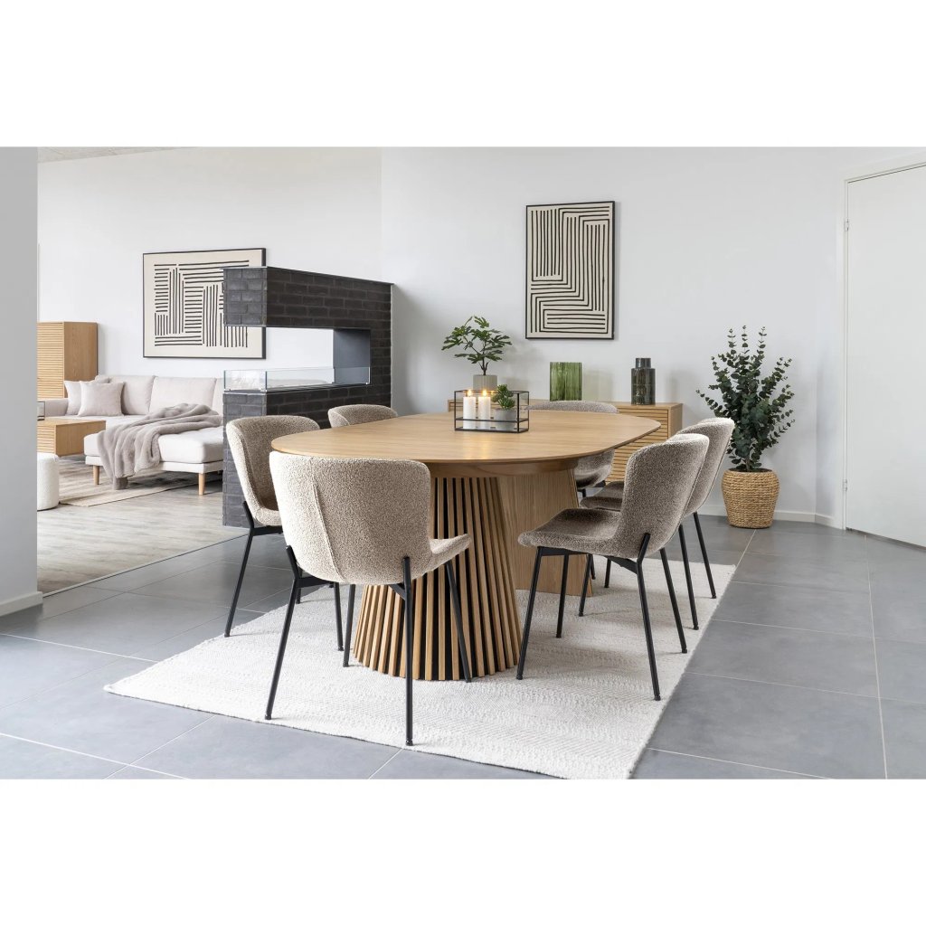 Táto jedálenská zostava v prírodnom dubovom dekore a neutrálnej béžovej látke skvele zapadne do moderných, škandinávskych aj prírodne ladených interiérov. Vďaka svojmu nadčasovému vzhľadu ju možno ľahko kombinovať s kovovými doplnkami, prírodnými textíliami aj svetlými či tmavšími odtieňmi v interiéri. Odporúčame doplniť o prestieranie z prírodných materiálov, dekoratívne vázy alebo sviečky pre vytvorenie príjemnej a útulnej atmosféry v jedálni.