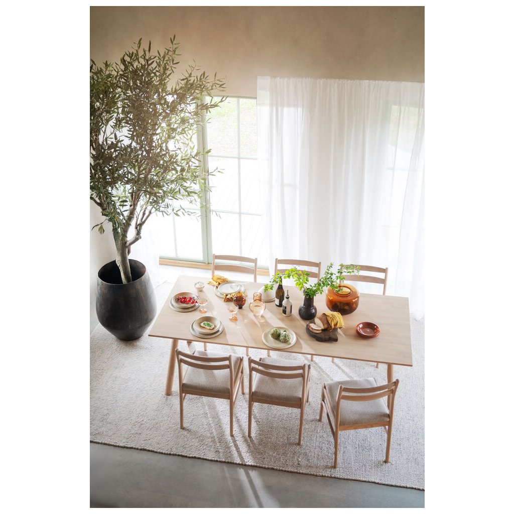 CLAPPERTON vynikne v vzdušných, moderných aj nadčasových interiéroch. Skvele sa kombinuje s jedálenskými stoličkami v prírodnej farbe dreva, čalúnenými odtieňmi béžovej, pieskovej alebo olivovej. Vďaka svojej jemnej farbe a prírodnému vzhľadu sa ľahko zladí s doplnkami z keramiky, skla či textílií vo svetlých zemitých tónoch. Odporúčame ho kombinovať s mäkkým osvetlením a minimalistickými dekoráciami pre podčiarknutie jeho dizajnového charakteru.