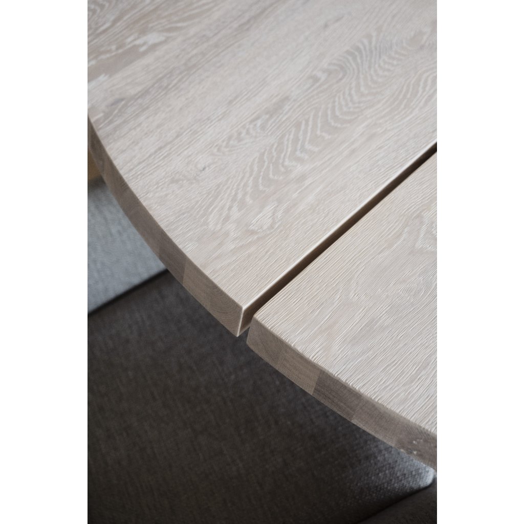 Kruhový jedálenský stôl FRED od švédskeho výrobcu dizajnového nábytku ROWICO. Stôl FRED tvoria štyri čierno lakované kovové nohy, ktoré zabezpečujú maximálnu stabilitu, nosnosť a pevnosť. Kruhová doska stola je z 2 častí masívneho dubového dreva s bielym pigmentom. Štýlový kruhový stôl, ktorý urobí veľkú parádu najmä vo väčších priestoroch.