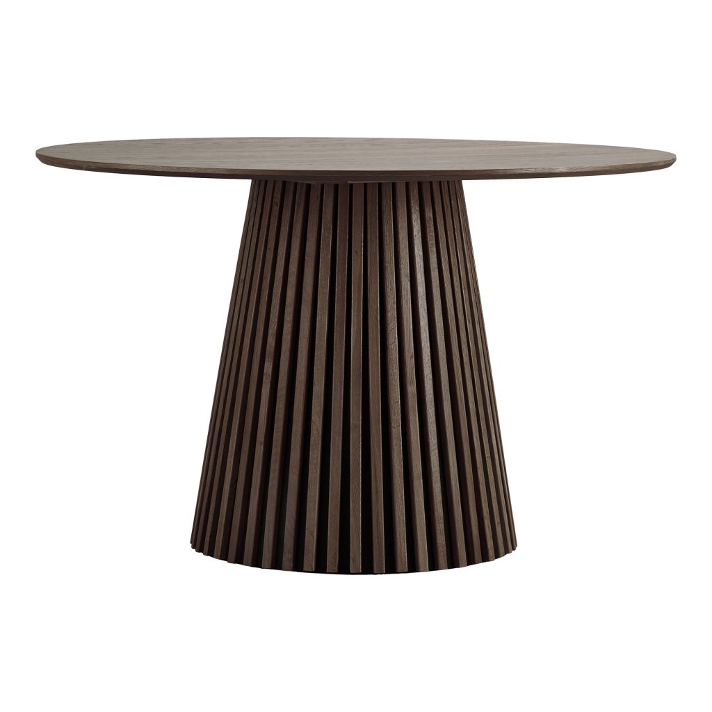 Krásny jedálenský stôl OSAKA od dánskej značky nádherného škandinávskeho nábytku HOUSE NORDIC. Jedálenský stôl spája prírodný vzhľad s praktickým riešením pre každodenné aj slávnostné stolovanie. Stolová doska s priemerom ø120 cm je vyrobená z kvalitnej MDF dosky s dubovou dyhou v tmavohnedom odtieni, ktorý zvýrazňuje kresbu dreva a dodáva priestoru teplo a harmóniu. Vďaka svojej výške 75 cm a priestrannému tvaru poskytuje pohodlné miesto na stolovanie až pre štyri osoby. Materiály nesú FSC certifikáciu, čo zaručuje šetrný prístup k prírode.