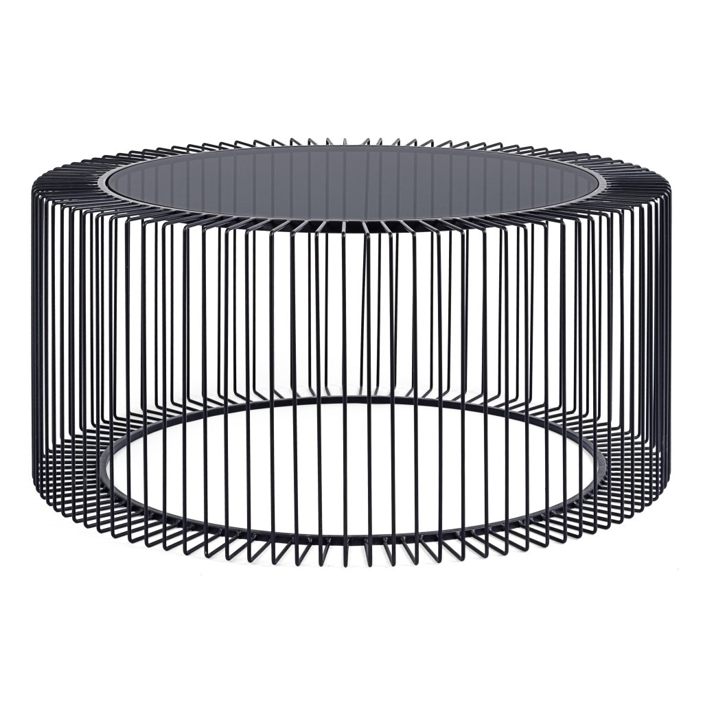 Konferenčný stolík KIERAN od talianskej spoločnosti pre štýlový nábytok BIZZOTTO. Stolík KIERAN je vyrobený z ocelovej konštrukcie, ktorá pripomína do kruhu tvarovanú klietku. Vrchná čierno sfarbená sklenená doska je vsadená do kruhovej konštrukcie a dodáva stolíku eleganciu. Stolík je vďaka svojmu spracovaniu veľmi stabilný a vnáša do vášho interiéru šmrnc a štýl. Dostupný aj v menšej veľkosti.