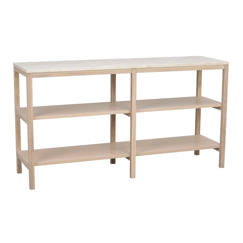 Konzolový stolík ORWEL od švédskeho výrobcu dizajnového nábytku ROWICO. Stôl ORWEL sa skladá z exkluzívnej travertínovej kamennej dosky a lakovaného dubového rámu s bielym pigmentom, ktorý poskytuje maximálna stabilita, nosnosť a pevnosť. Travertín je druh vápenca s krásnou živou štruktúrou, ktorá dodáva stolu prirodzenú krásu. Stôl má certifikát FSC, čo znamená, že drevo pochádza z ekologických zdrojov. Skvelý stolík na použitie v predsieni alebo ako TV stolík v obývacej izbe. Stôl má veľmi praktické police, ktoré sa budú hodiť na dekorácie alebo knihy.