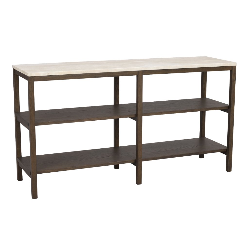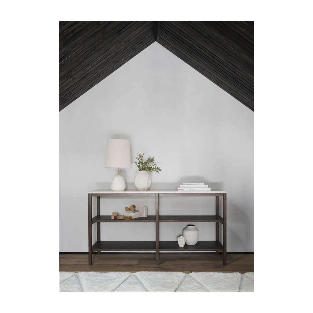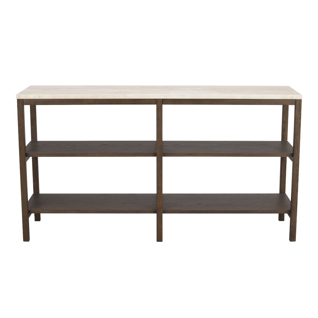 Konzolový stolík ORWEL od švédskeho výrobcu dizajnového nábytku ROWICO. Stôl ORWEL sa skladá z exkluzívnej travertínovej kamennej dosky a hnedého lakovaného dubového rámu, ktorý poskytuje maximálna stabilita, nosnosť a pevnosť. Travertín je druh vápenca s krásnou živou štruktúrou, ktorá dodáva stolu prirodzenú krásu. Stôl má certifikát FSC, čo znamená, že drevo pochádza z ekologických zdrojov. Skvelý stolík na použitie v predsieni alebo ako TV stolík v obývacej izbe. Stôl má veľmi praktické police, ktoré sa budú hodiť na dekorácie alebo knihy.