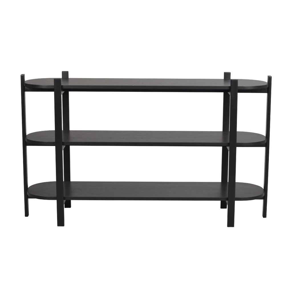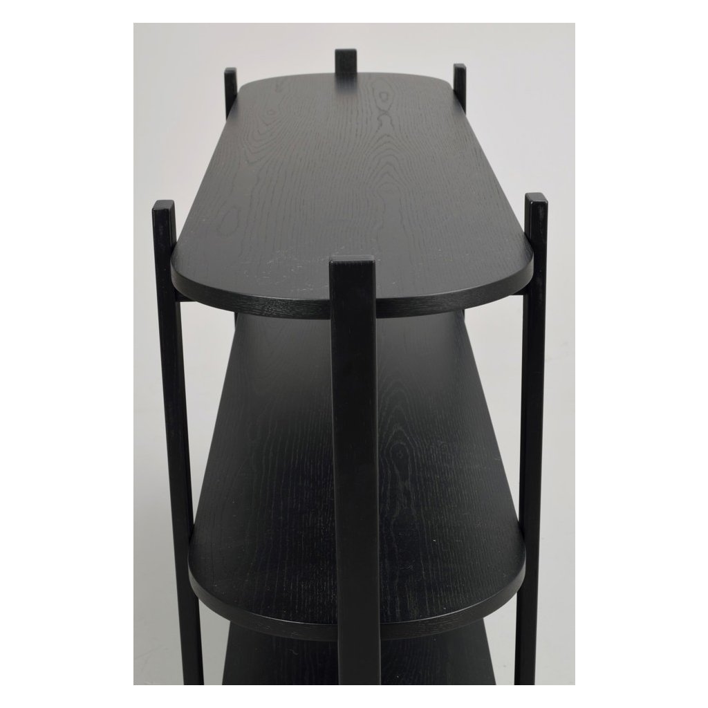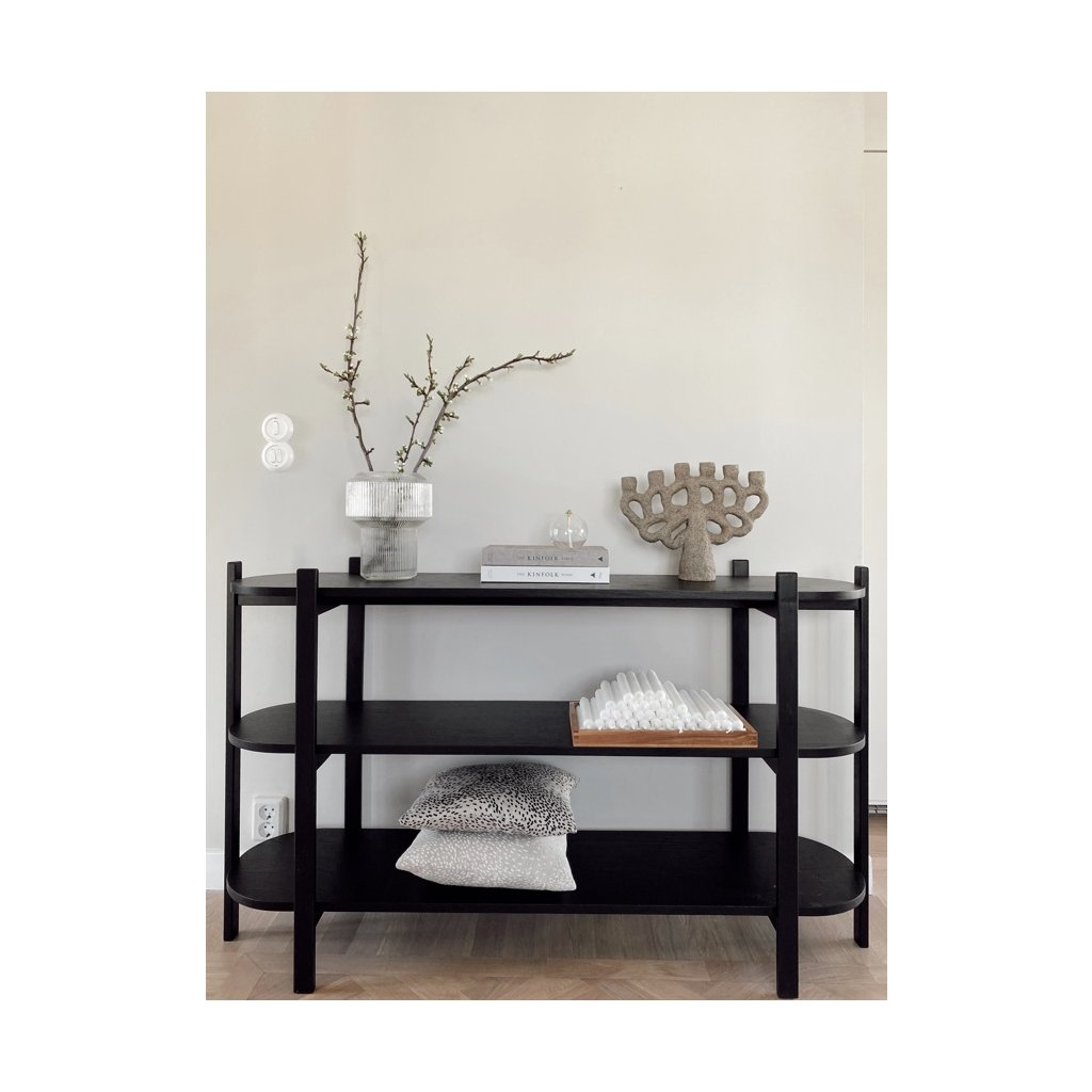 Konzolový stolík TOLSONA od švédskeho výrobcu dizajnového nábytku ROWICO. Stôl TOLSONA je veľmi praktický a elegantný konzolový stôl so zaoblenými rohmi. Je vyrobený z masívneho dubového dreva v čiernom vyhotovení. Police sú vyrobené z MDF s dubovou dyhou. Konzolový stolík je ideálny do predsiene, spálne alebo obývačky. Stôl TOLSONA má šesť pevných nôh, ktoré mu dodávajú stabilitu a jedinečný vzhľad. Tabuľka má certifikát FSC, ktorý označuje ekologicky získané drevo.