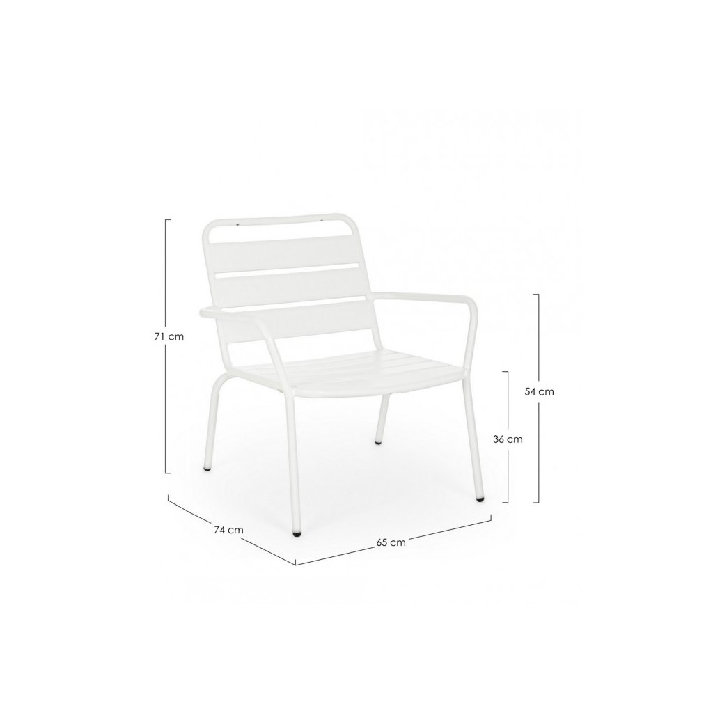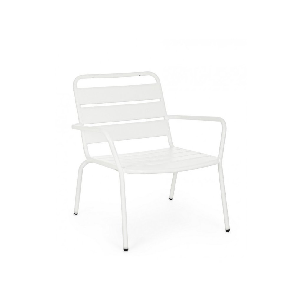 Designové záhradné kovové kreslo MARLYN od talianskej spoločnosti štýlového nábytku BIZZOTTO. Kreslo MARLYN je kompletné vyrobené z kovu s bielou striekanou farbou a je tak vynikajúce pre vonkajšie použitie. Tvoria ho 4 tenké nohy, sedadlo a opierka z kovových platní s medzerami a 2 područky. Vďaka konštrukcii je odolné, stabilné a pevné. Dostupné aj v ďalších farebných variantoch alebo vo vyhotovení v hojdacom kresle pod názvom LILLIAN.