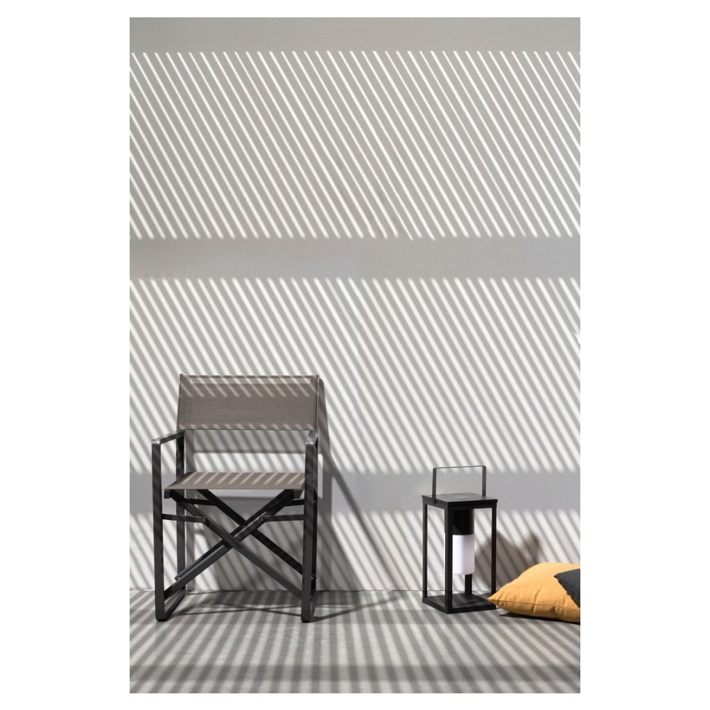 Záhradná solárna lucerna SQUARE talianskeho výrobcu štýlového nábytku BIZZOTTO. Záhradná lucerna je vyrobená predovšetkým z čierno lakovaného kovu s centrálnym svetlom, ktoré nabíja batérie, ktoré je možné dobíjať pripojeným USB káblom alebo solárnymi panelmi na vrchu. Na lepšiu manipuláciu slúži vrchná rukoväť. Ideálny parťák pre vašu terasu alebo balkón.