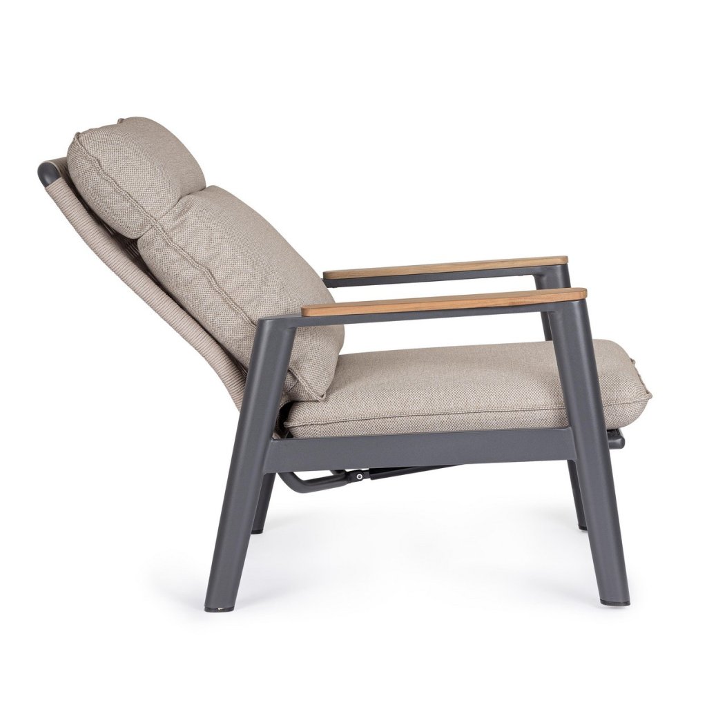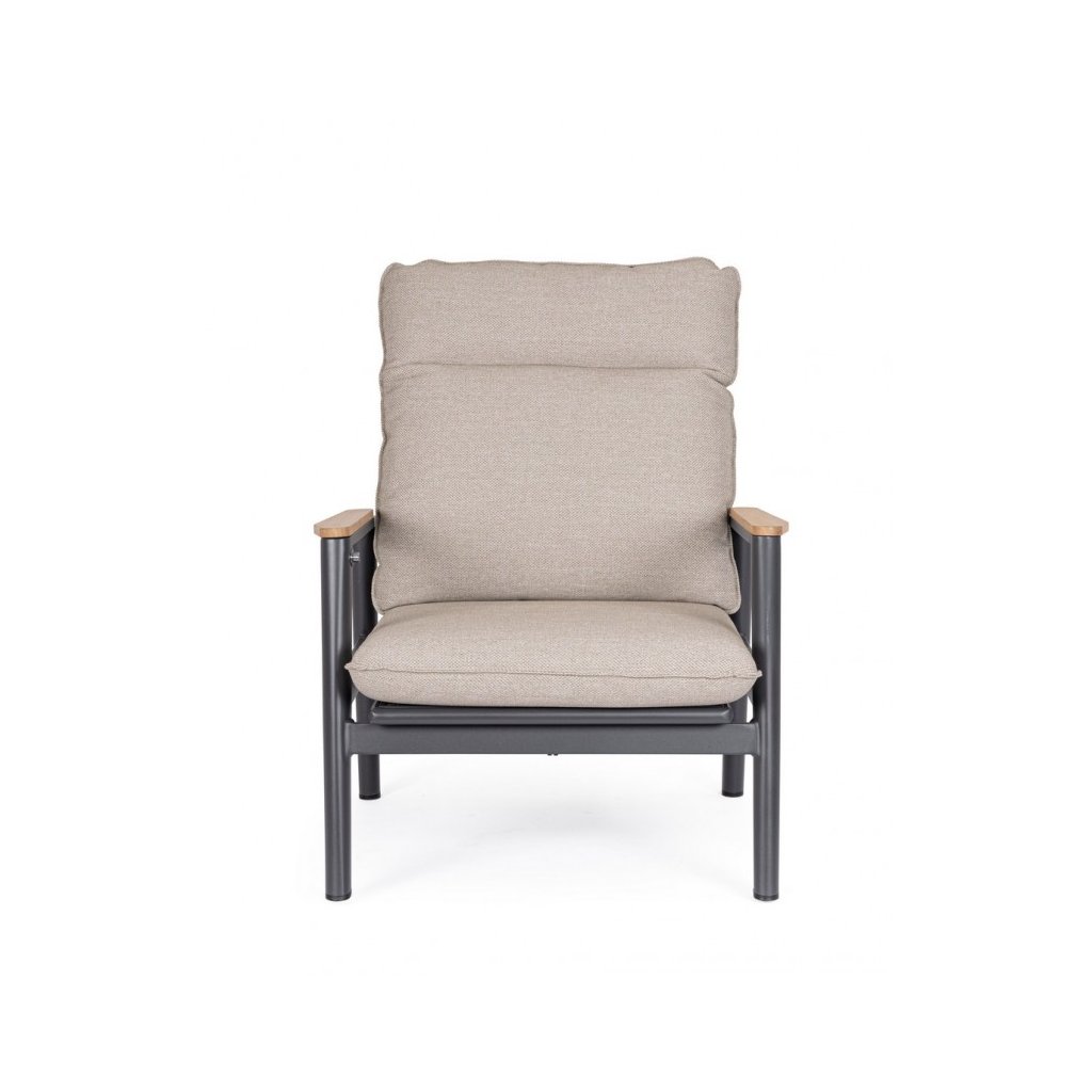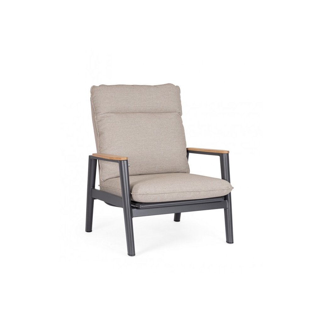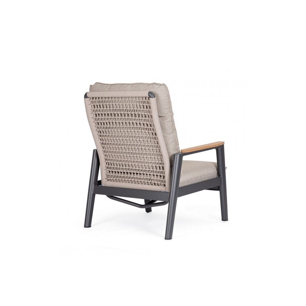 Dizajnové záhradné kreslo MIGUEL od talianskeho výrobcu nádherného nábytku BIZZOTTO. Stolička sa dodáva s práškovo lakovanou hliníkovou konštrukciou. Opierky na ruky majú vložky z teakového dreva a podrúčky sú vypletené olefínovým lanom. Kreslo sa môže pochváliť odnímateľnými vankúšmi z nepremokavej olefínovej tkaniny. Vďaka odolnému materiálu sa môže používať ako vo vnútri, tak aj vonku.