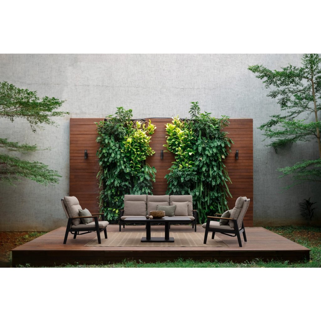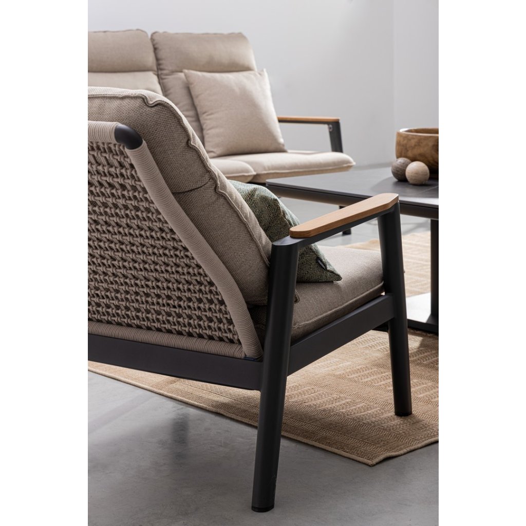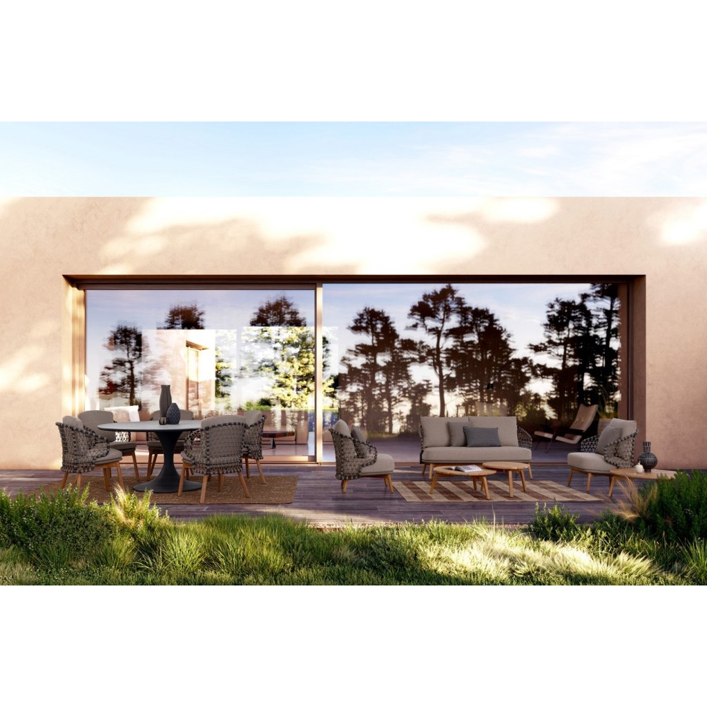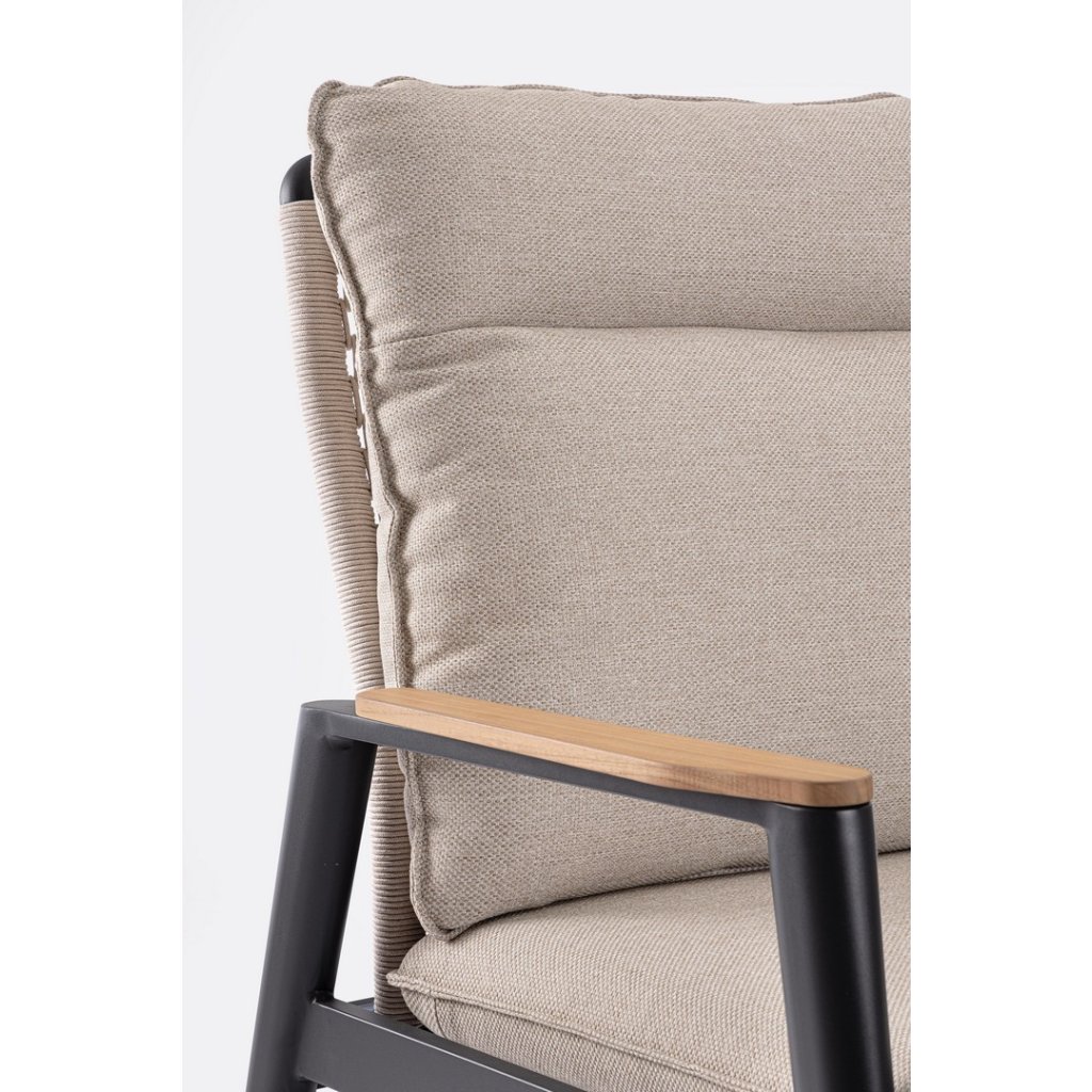 Dizajnové záhradné kreslo MIGUEL od talianskeho výrobcu nádherného nábytku BIZZOTTO. Stolička sa dodáva s práškovo lakovanou hliníkovou konštrukciou. Opierky na ruky majú vložky z teakového dreva a podrúčky sú vypletené olefínovým lanom. Kreslo sa môže pochváliť odnímateľnými vankúšmi z nepremokavej olefínovej tkaniny. Vďaka odolnému materiálu sa môže používať ako vo vnútri, tak aj vonku.