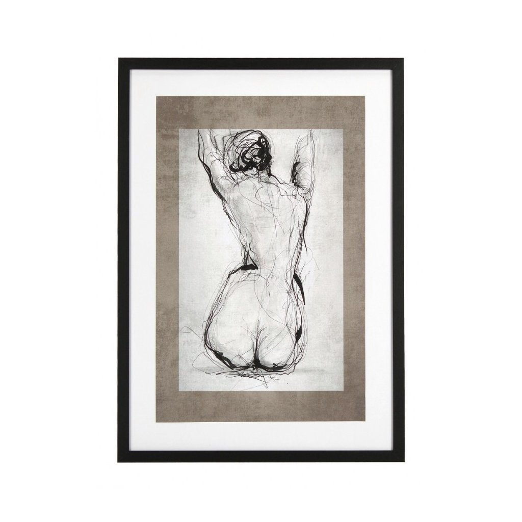 Obraz BACK od talianskeho výrobcu štýlového nábytku a doplnkov BIZZOTTO. Obraz BACK má rozmery 50x70 cm a jedná sa o tlač na papier, ktorý je položený na podložke z drevovláknitej mdf dosky, zakrytý sklom a zarámovaný v svetlom drevenom ráme. Ide o zaujímavú a jednoduchú skicu ženského tela pomocou čiernych čiar. Skica je potom ohraničená hnedou a bielou paspartou.
