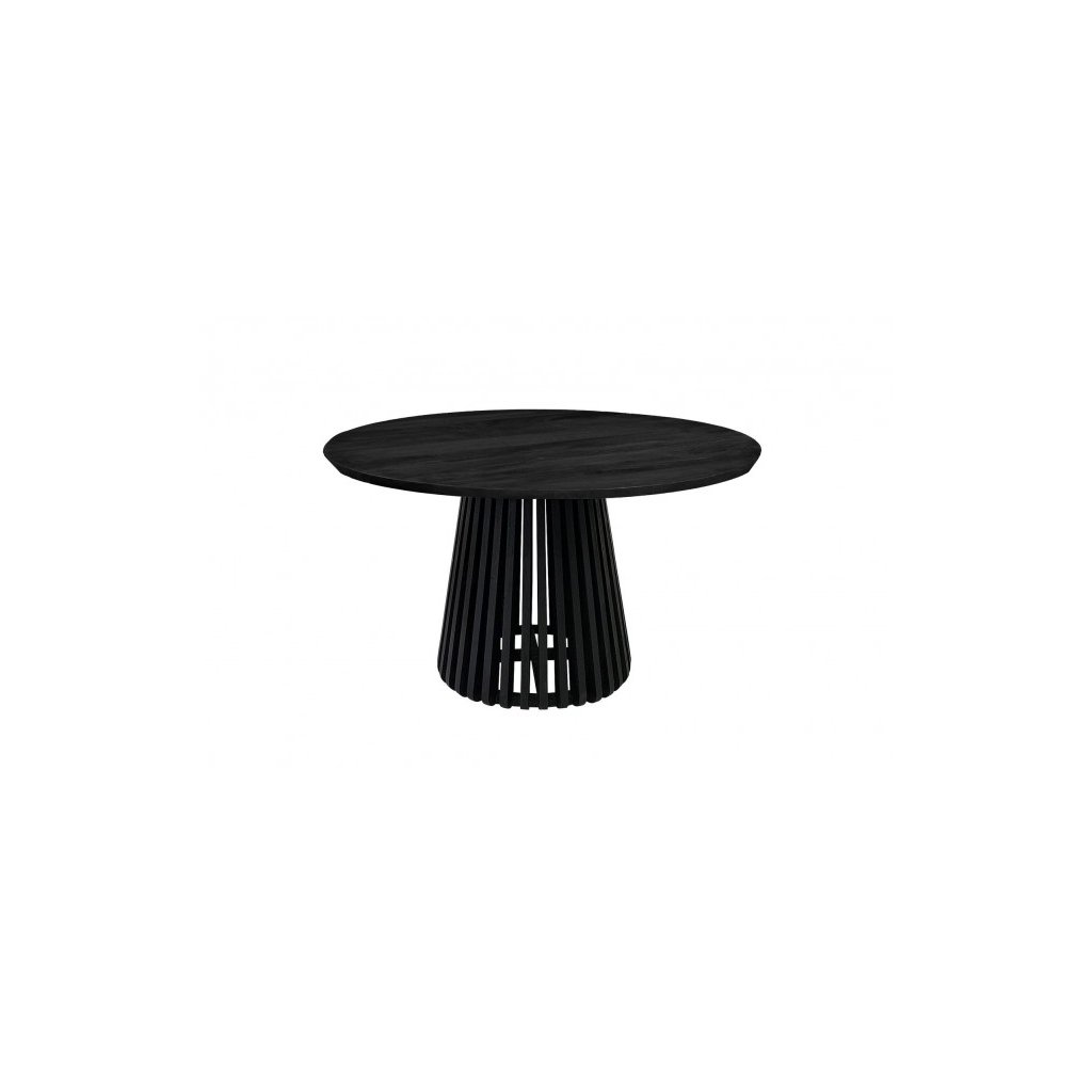Dizajnový okrúhly jedálenský stôl ODION od talianskeho výrobcu štýlového nábytku BIZZOTTO. Stôl ODION s doska s priemerom 130 cm je kompletne vyrobený z mangové drevo v čiernej farbe. Má jedna robustná noha, ktorá má veľmi originálny dizajn, vďaka ktorému je stôl ešte zaujímavejší.