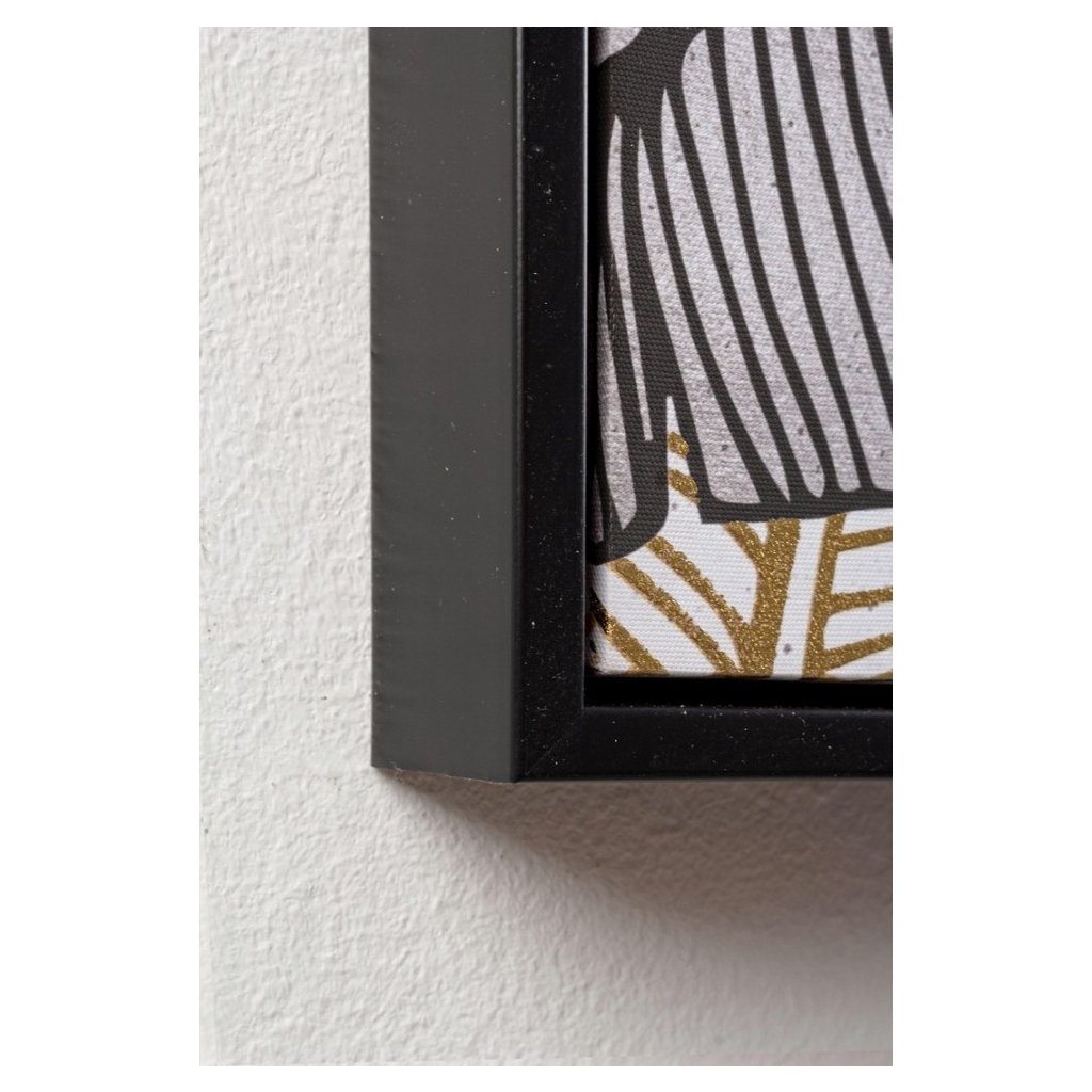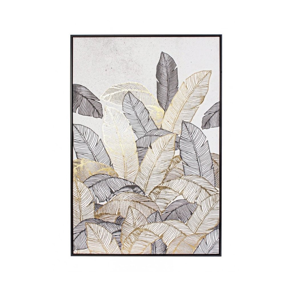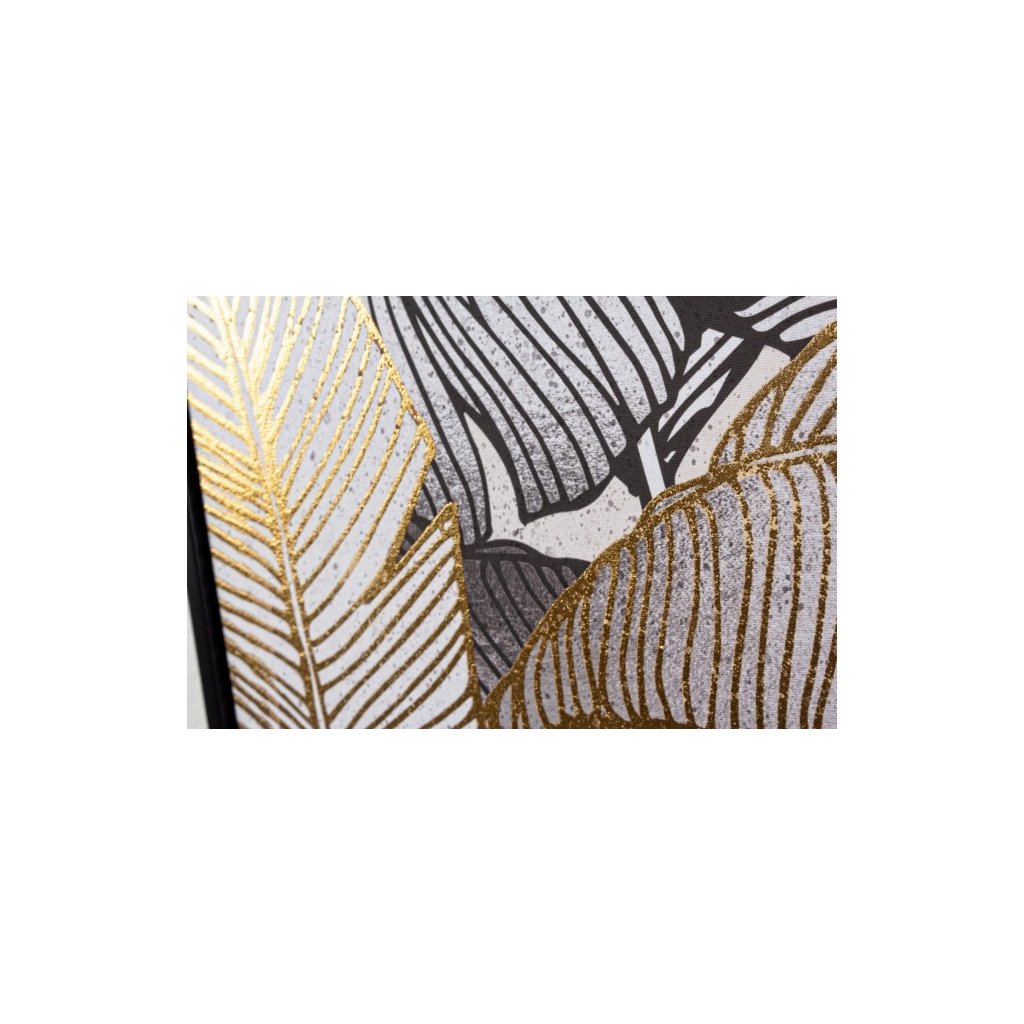 Olejomaľba LEAVES od talianskeho výrobcu štýlového nábytku a doplnkov BIZZOTTO. Obraz LEAVES má rozmery 122x82 cm a jedná sa o olejomaľbu na plátne, ktoré je natiahnuté na dosku z drevovláknitej mdf a zasadené do plastového rámu v čiernej farbe. Ide o maľbu, v ktorej prevládajú listy jednotlivých rastlín so zlatými alebo čiernymi obrysy na svetlom pozadí.