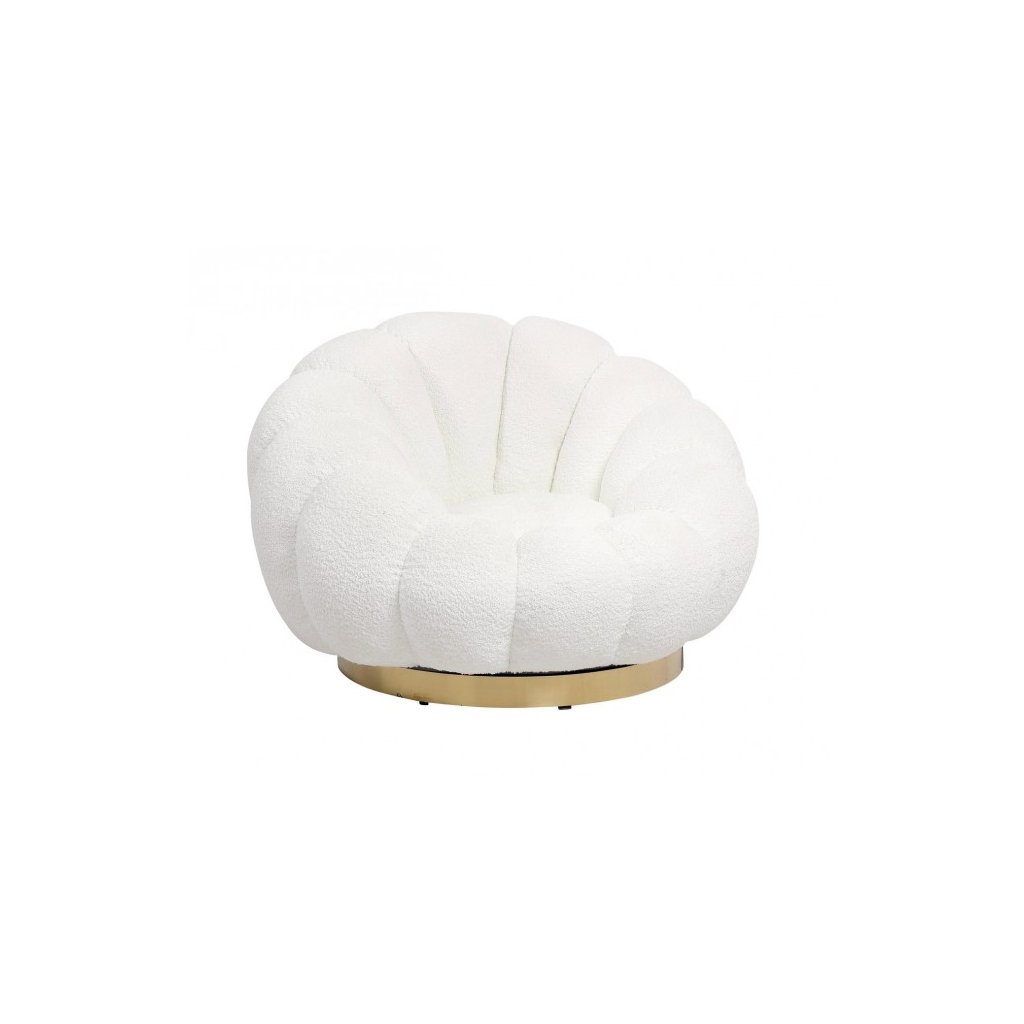 Otočné kreslo FLOREL od talianskeho výrobcu štýlového nábytku BIZZOTTO. Kostru tohto krásneho kresla tvorí rám v kombinácii dreva a kovu, na ktoré nadväzuje pevná pena a krásny poťah s efektom buclé v bielej farbe. Kreslo má typické okrasné vlnky na opierke. Zdobí ho aj zlatý prstenec na spodnej nohe. Kreslo je otočné o celých 360 stupňov. K dostaniu aj v ďalších farbách.