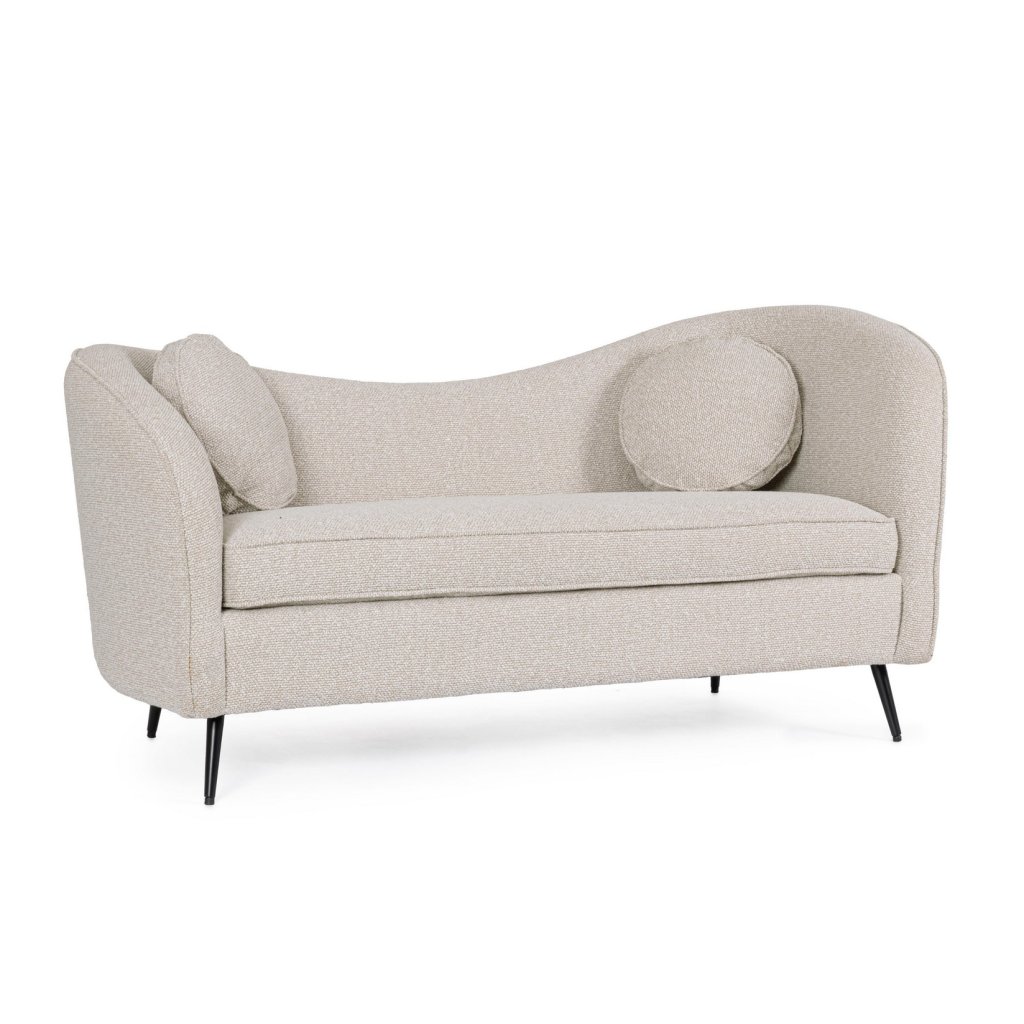 Krásna pohovka CANDIS od talianskeho výrobcu kvalitného nábytku BIZZOTTO s konštrukciou z preglejky a borovicového dreva doplnené o kovové nohy. Béžový bouclé poťah je prekrytý cez polyuretánovú penu. Krásne nerovnomerné línie hornej opierky dopĺňajú dva odnímateľné okrúhle vankúše. Veľmi krásna a štýlová pohovka.