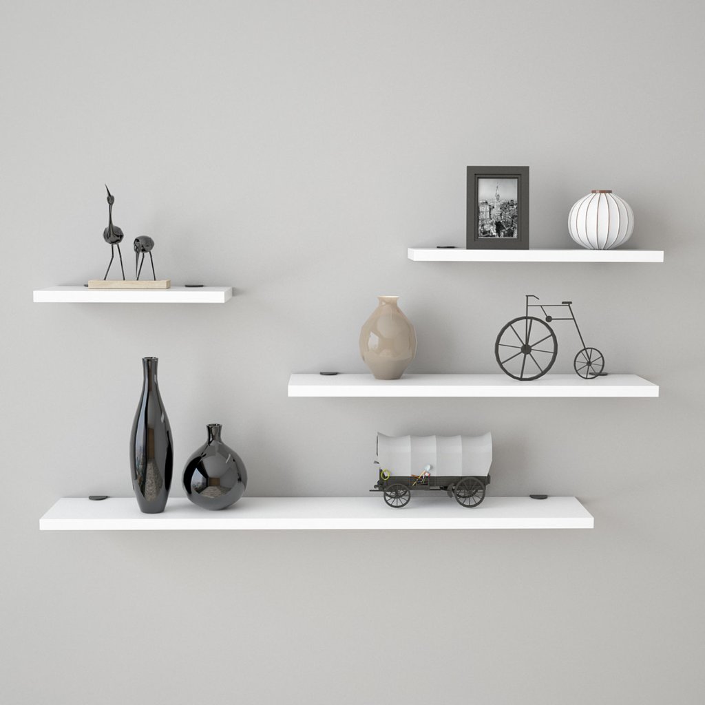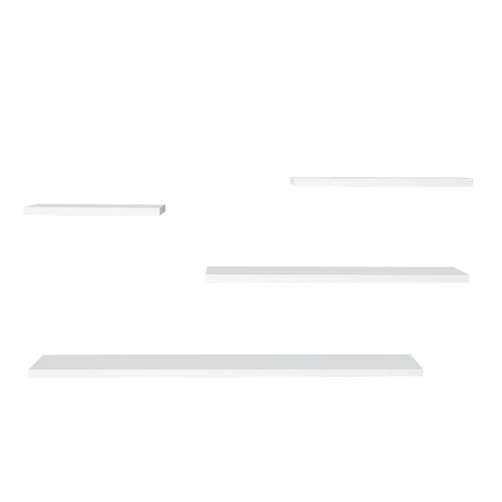 Jednoduchý set 4 poličiek WALL od výrobcu štýlového nábytku KALUNE DESIGN. Set tvoria 4 rôzne dlhé poličky z drevotriesky s melaminovou fóliou a krásnym bielym dekorom. Dĺžka políc je 90, 60, 40 a 30 centimetrov, šírka potom vždy 14, 5 centimetrov. Poličky držia takmer neviditeľné držiaky, ktoré sú upevnené do steny. Vďaka tomu tak môžete krásne ozdobiť jednu zo svojich stien a vystaviť svoje dekorácie.