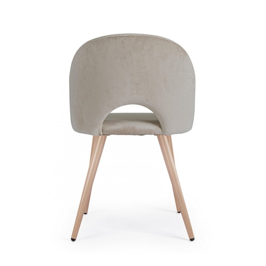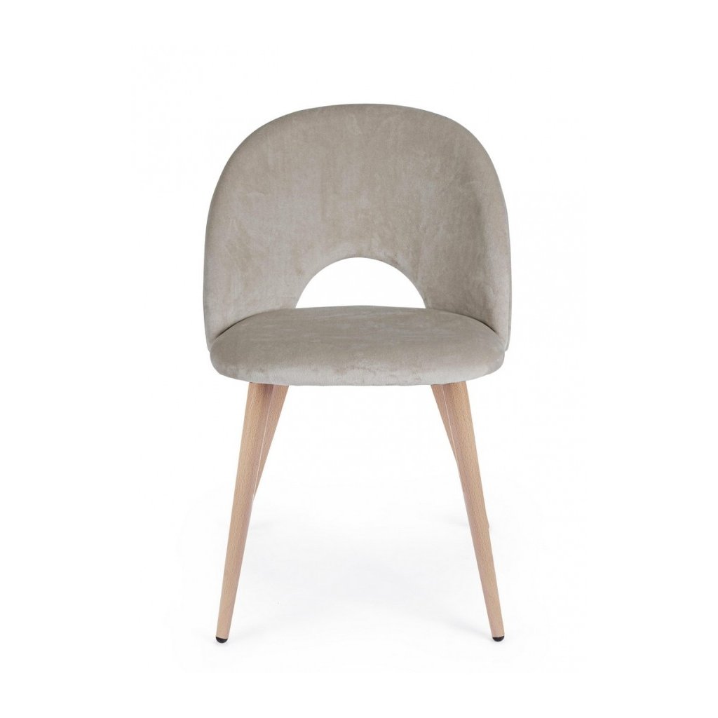 Designová sametová jídelná stolička LINZEY od talianskeho výrobcu štýlového nábytku BIZZOTTO. Stolička je dodávaná v prevedení kovových noh s vzhľadom svetlého dreva, čo vytvára krásnu stoličku a zvyšuje stabilitu a pevnosť stoličky. Nohy sú pripevnené zo spodu k sedáku konštruovaného z pevnej preglejky, ktorý je obalený výplňou z polyuretánu, aby zabezpečil maximálne pohodlné sedenie, a nakoniec potiahnutý krásnym a hebkým sivým sametovým poťahom. V strede opierky potom nájdete štýlový otvor pre lepšiu manipuláciu.