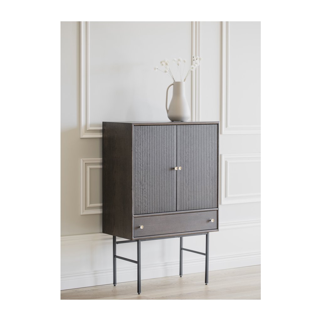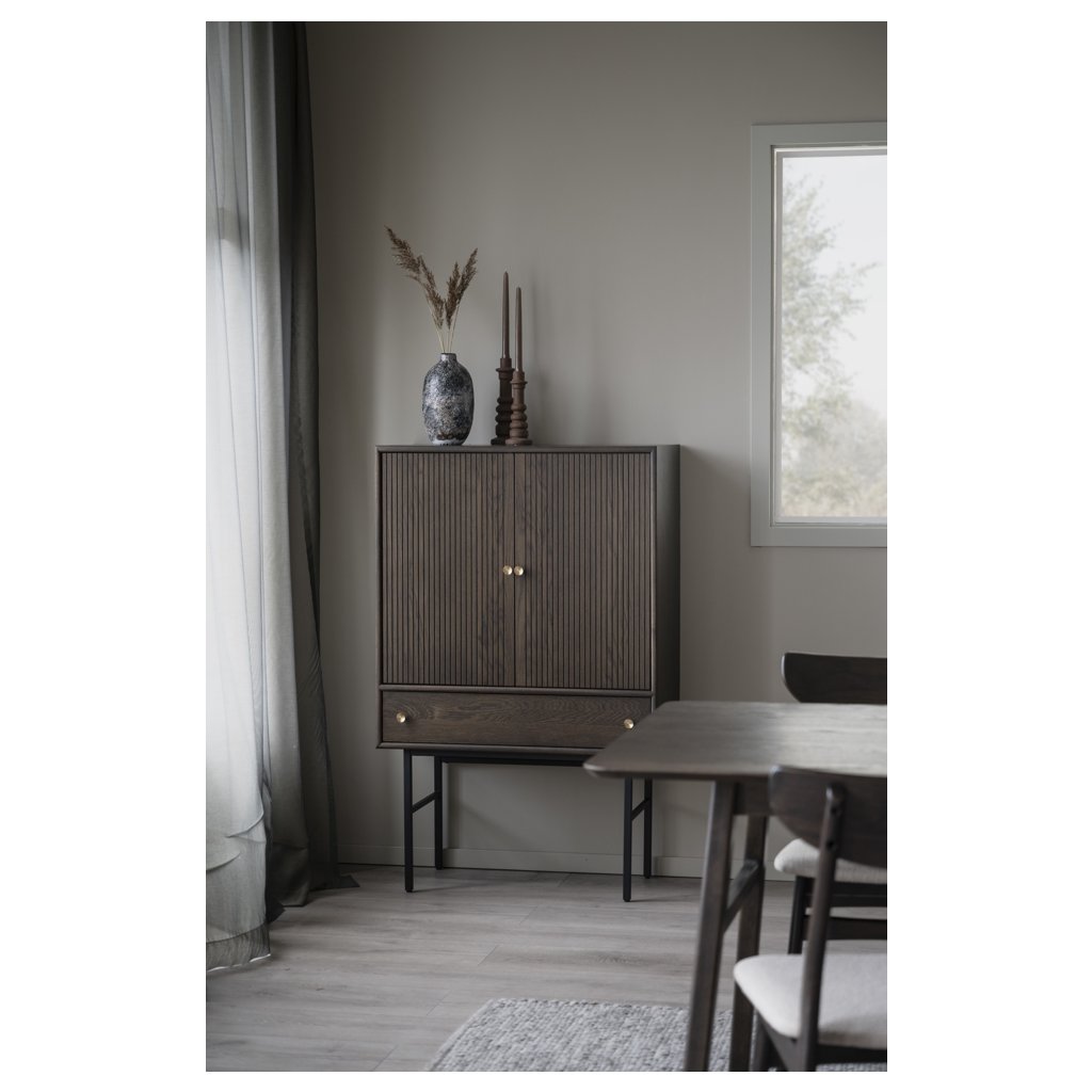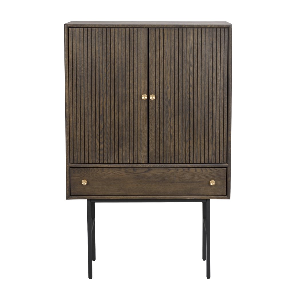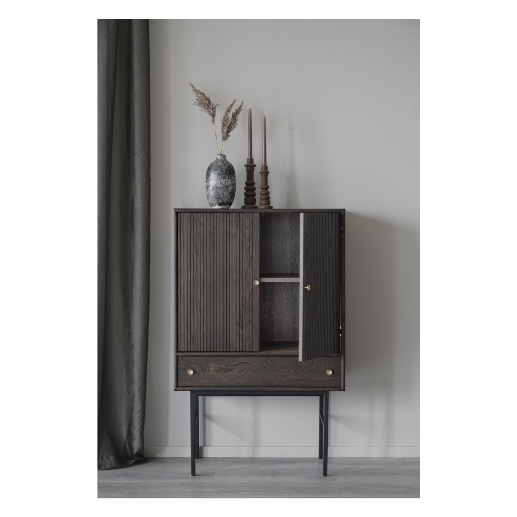 Dizajnový kabinet CLEARBROOK od švédskeho dizajnového výrobcu ROWICO. Elegantná skrinka je vyrobená v krásnej hnedej dubovej farbe s čiernymi kovovými nohami. Skrinka má vo vnútri drevenú poličku a v spodnej časti praktickú zásuvku. Úchytky majú mosadzné kovanie. Skriňa je veľmi praktická vďaka veľkému úložnému priestoru. Skrinku môžete doplniť ďalším nábytkom z rovnakého radu CLEARBROOK a vytvoriť tak dokonalý interiér.