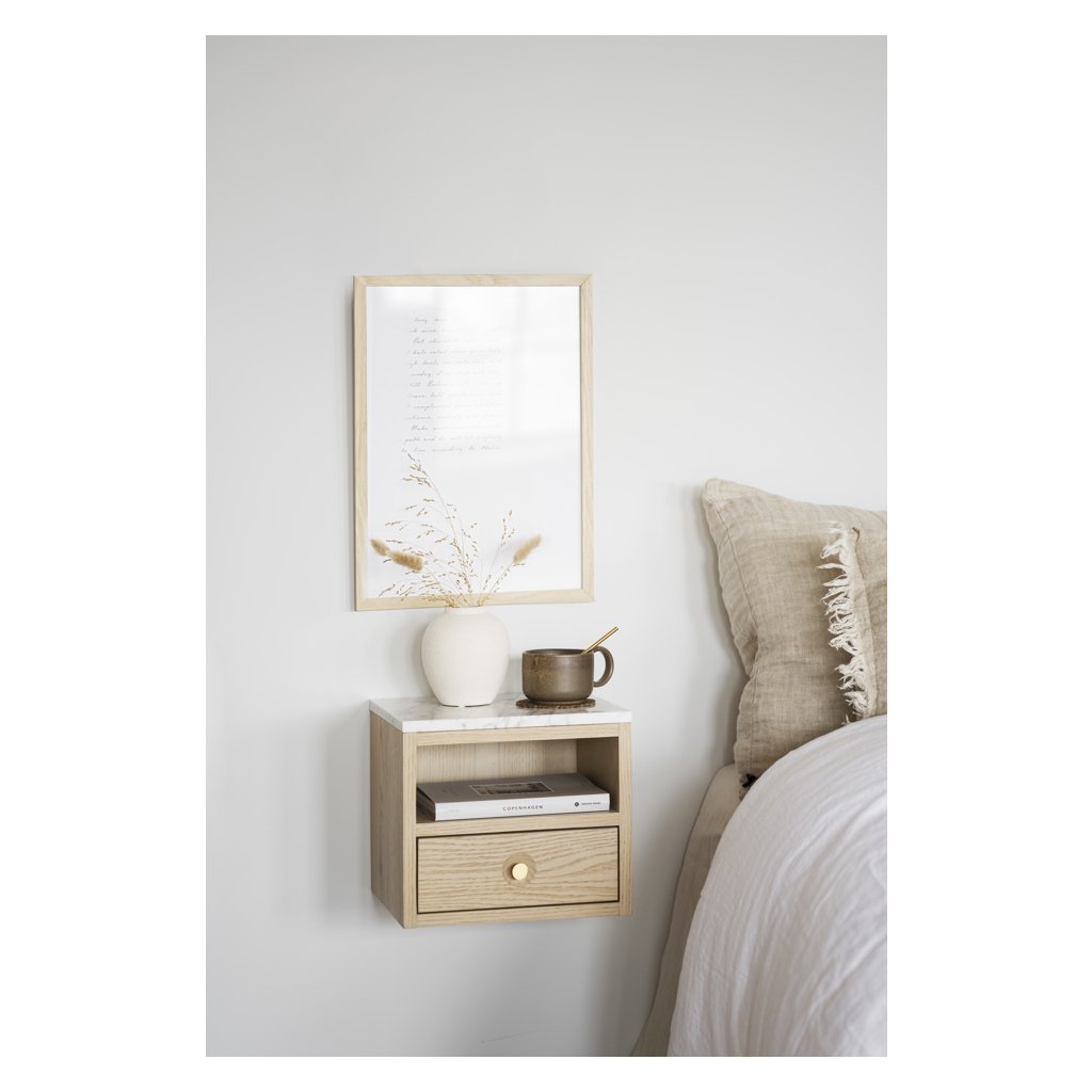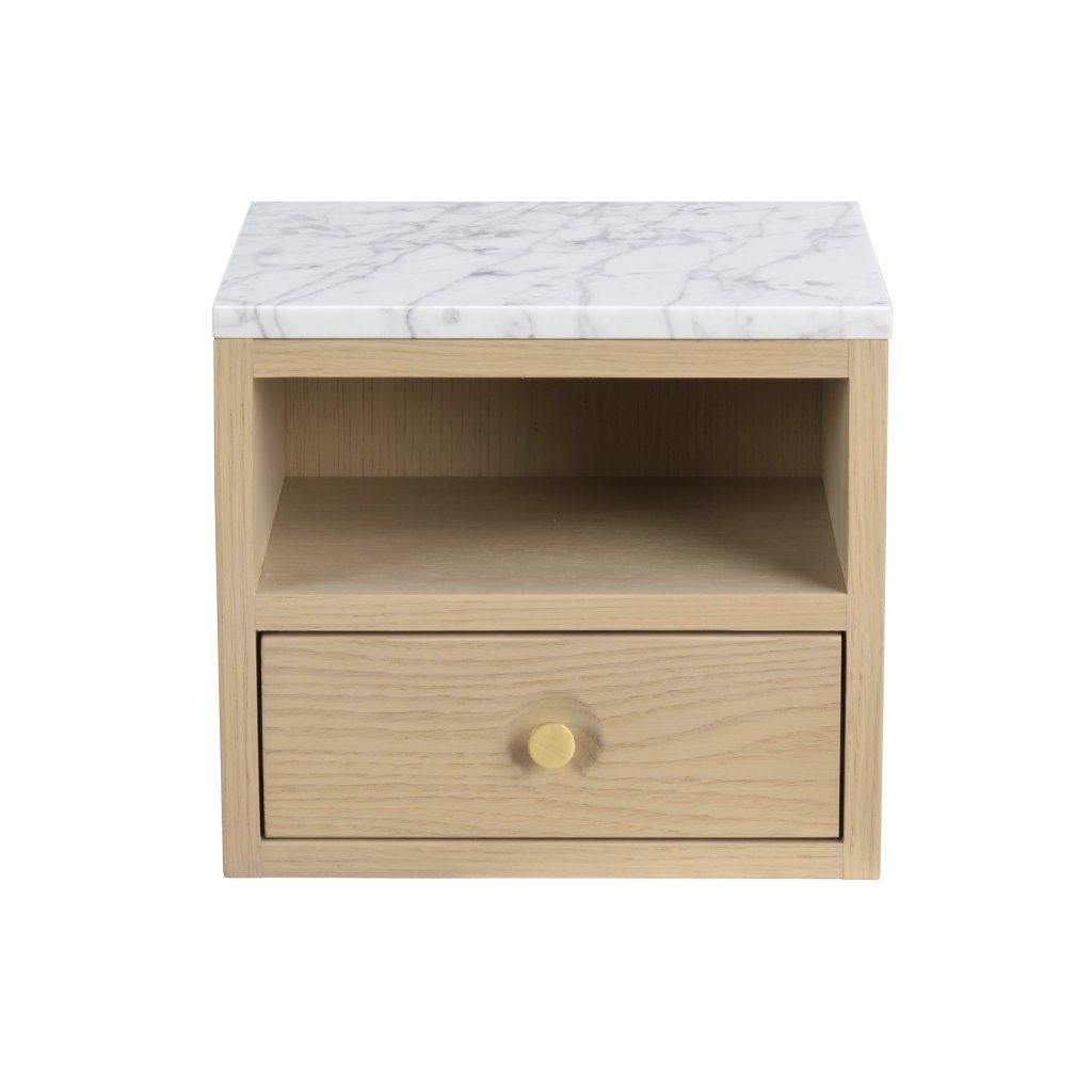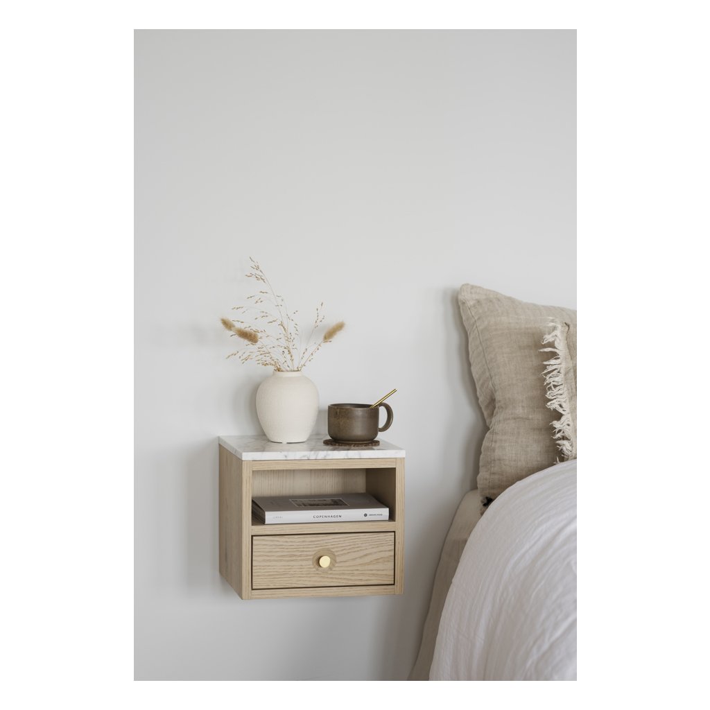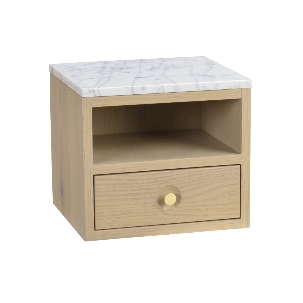 Dizajnový nočný stolík WHITMORE od švédskeho dizajnového výrobcu ROWICO. Elegantný nočný stolík alebo tiež nástenná polica je vyrobená z bieleného dubového dreva. Stolík má bielu mramorovú dosku a zásuvku s krásnou mosadznou úchytkou. Skvele sa hodí do predsiene alebo spálne. Nočný stolík má jednu zásuvku, ktorá ponúka veľmi praktický úložný priestor. Doplňte stolík ďalším nábytkom od výrobcu ROWICO pre dokonalý interiér.