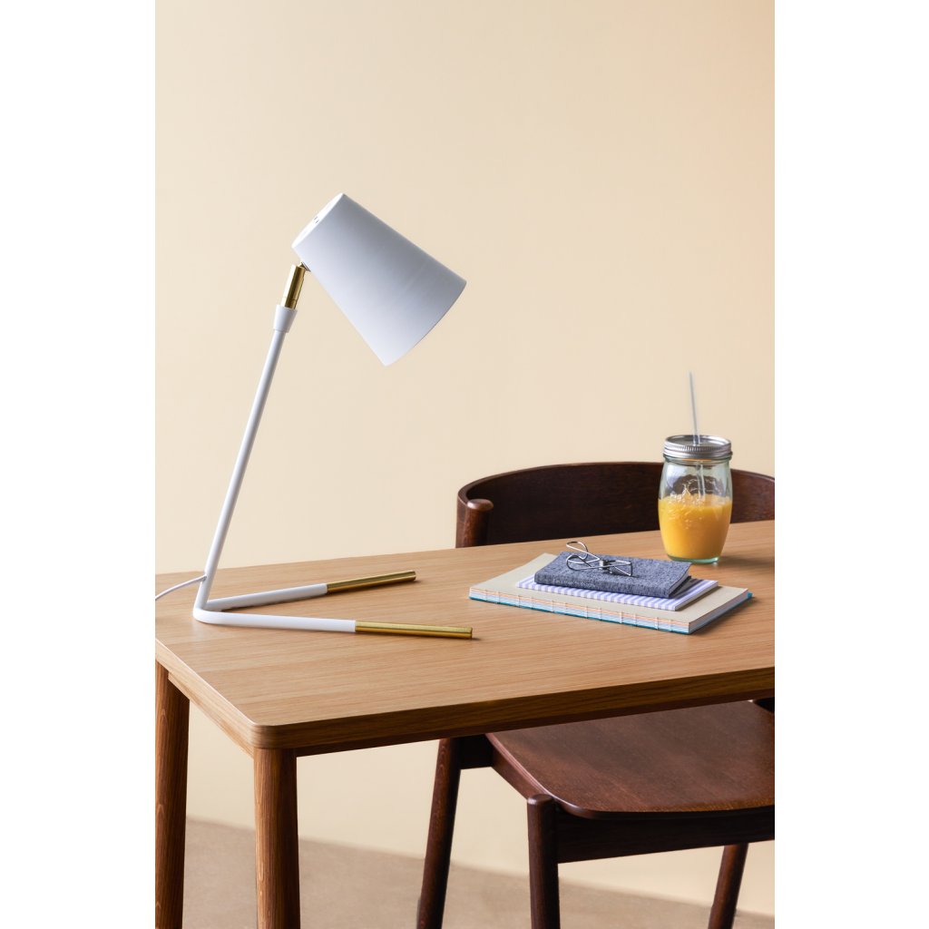 Dizajnová stolová lampa SLANT od dánskej škandinávskej nábytkárskej značky HÜBSCH. Lampa je kompletne vyrobená z bieleho kovu s mosadznými prvkami . Skladá sa zo základne zloženej z dvoch nôh, na ktorú nadväzuje tienidlo . Vďaka svojmu dizajnu vyzerá SLANT luxusne a hodí sa do moderných interiérov. Je ideálny na pracovný stôl v pracovni, na nočný stolík alebo na iné miesto.