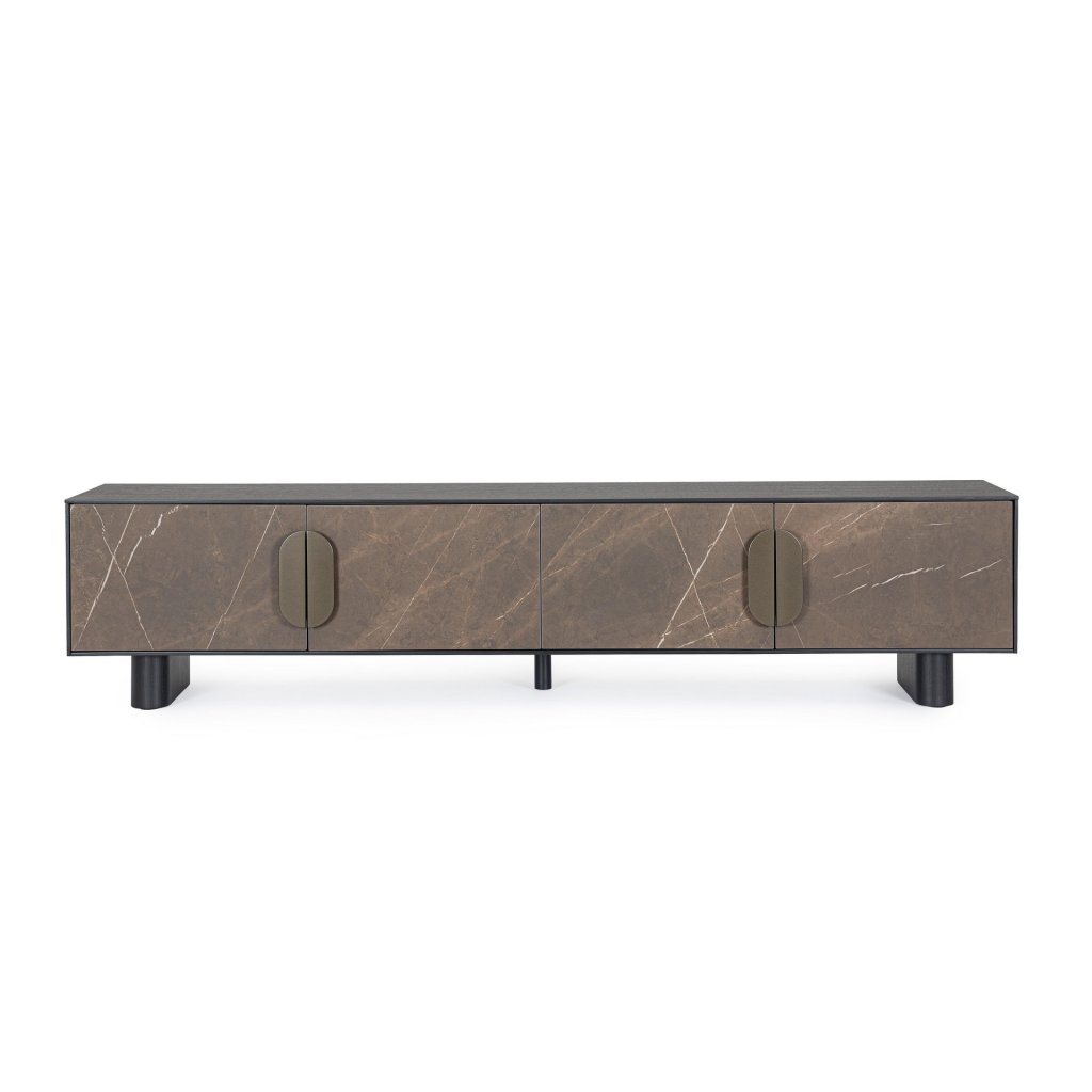 Dizajnový TV stolík GARRISON od talianskej firmy štýlového nábytku BIZZOTTO. Stolík GARRISON je vyrobený z mdf dosiek a čierno lakovanej dubovej dyhy. Predné dvierka sú potom z keramiky v krásnom prevedení tmavého mramoru s mosadzne vyzerajúcimi dvierkami . Za dvierkami dostatočný priestor na vaše nosiče alebo elektroniku.