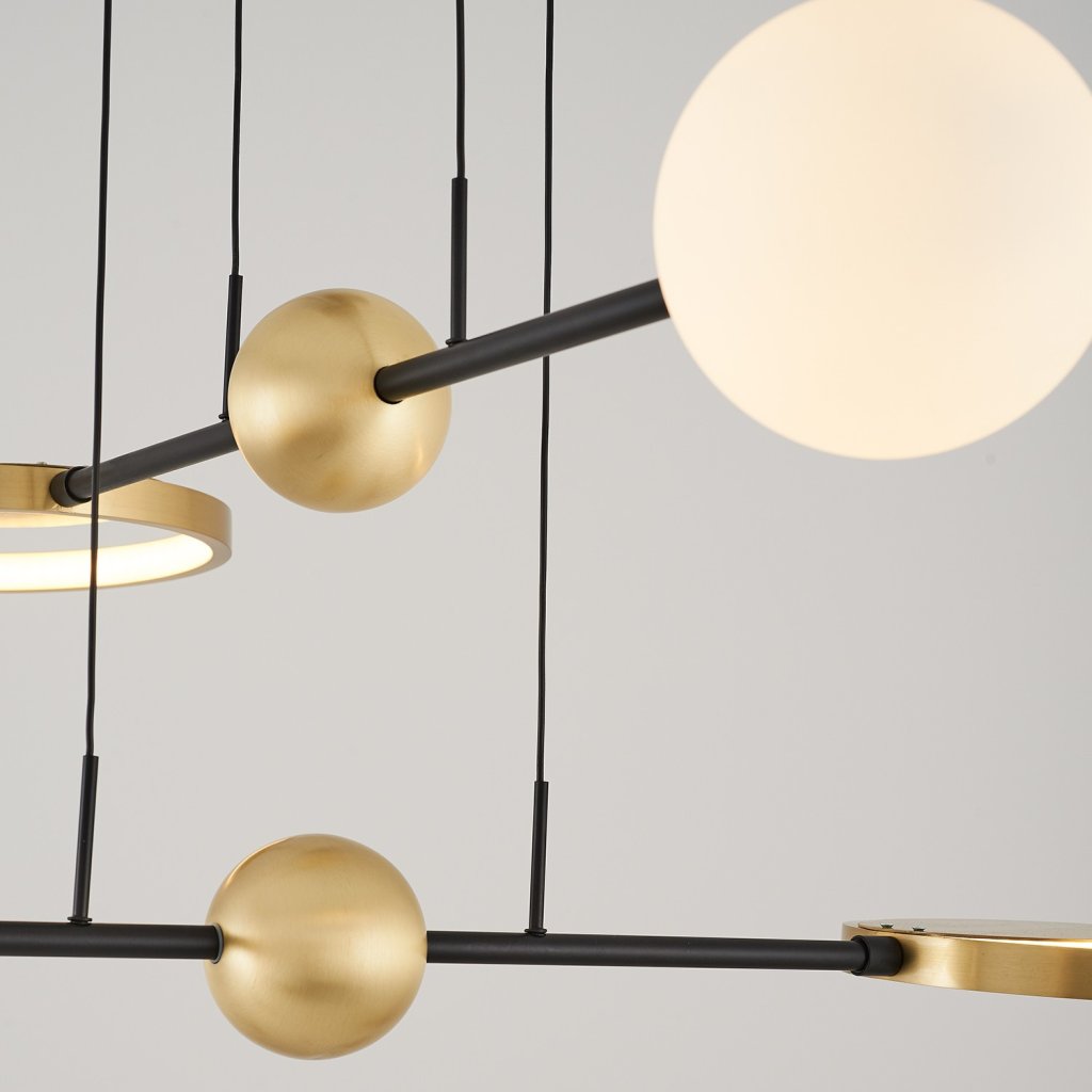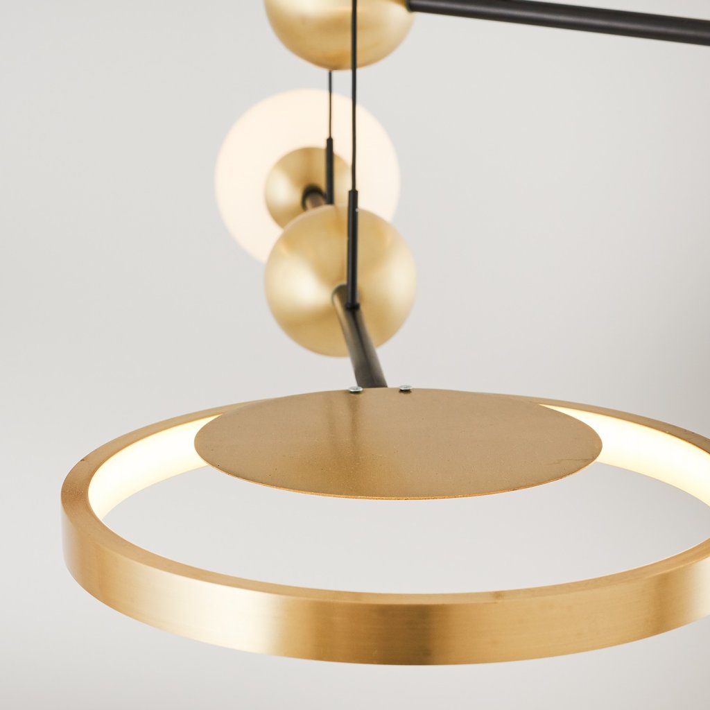 Štýlové závesné svetlo ANTIQUE od výrobcu designových svetiel OPVIQ. ANTIQUE tvorí vrchnú kovovú krytku na zakrytie káblov a uchytenie do stropu, zo ktorého vychádzajú čierne káble. Na nich sú kolmo pripevnené 3 samostatné rozvádzné čierne kovové tyče. Uprostred tyčí sú pripevnené zlaté guľky. Na stranách tyčí sú umiestnené stínidlá v dvoch rôznych prevedeniach. Vzájomne vytvárajú nádherné osvetlenie, ktoré vám bude každý závidieť.
