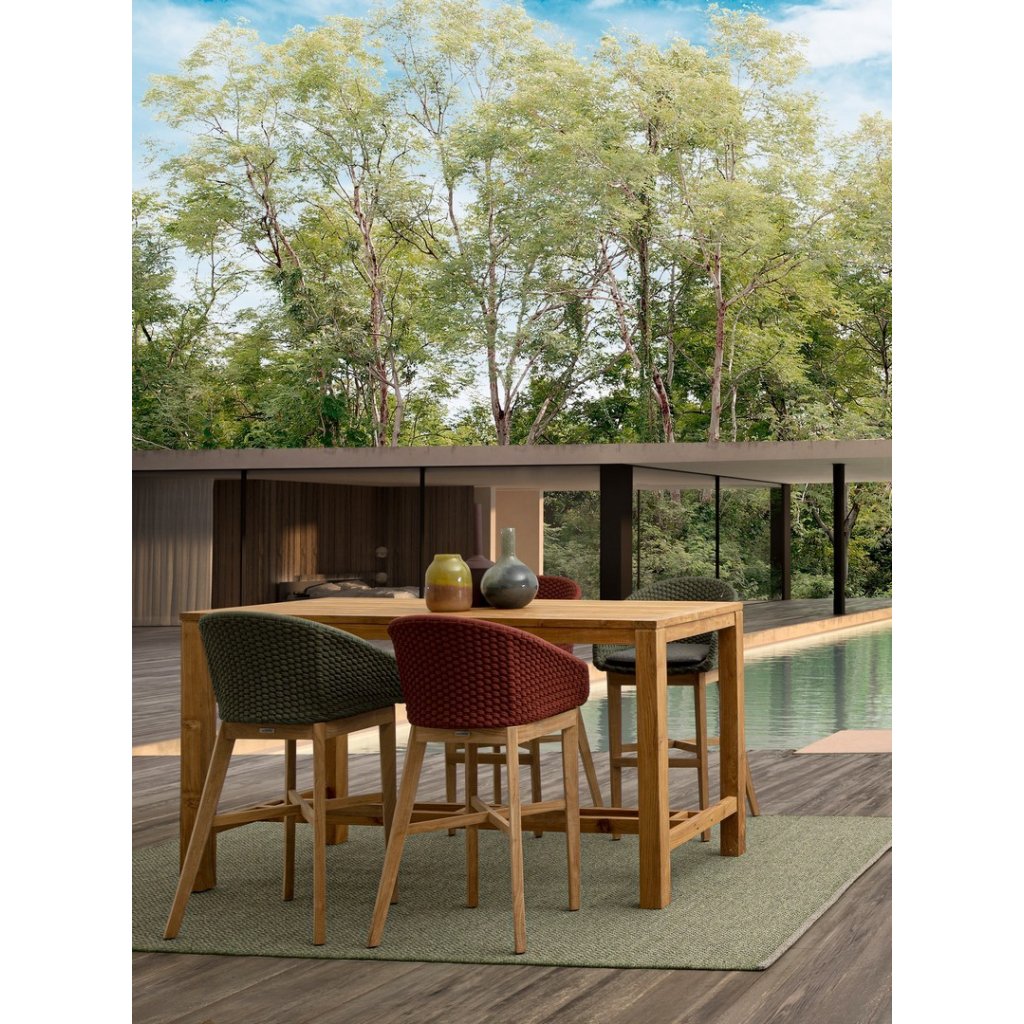 Designový barový stolička s opierkami COACHELLA od talianskej spoločnosti štýlového nábytku BIZZOTTO. Stolička COACHELLA tvorí pevný rám z hliníka, ktorý je potiahnutý olefinovou látkou v zelenej farbe. Sedadlo je odnímateľné a tiež z odolnej látky olefin. Štyri drevené nohy z teaku so vzpruhou zaručujú maximálnu stabilitu a nosnosť. COACHELLA vystupuje ako luxusné, pohodlné kreslo.