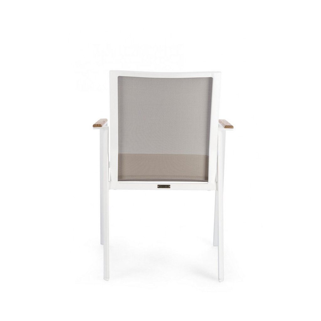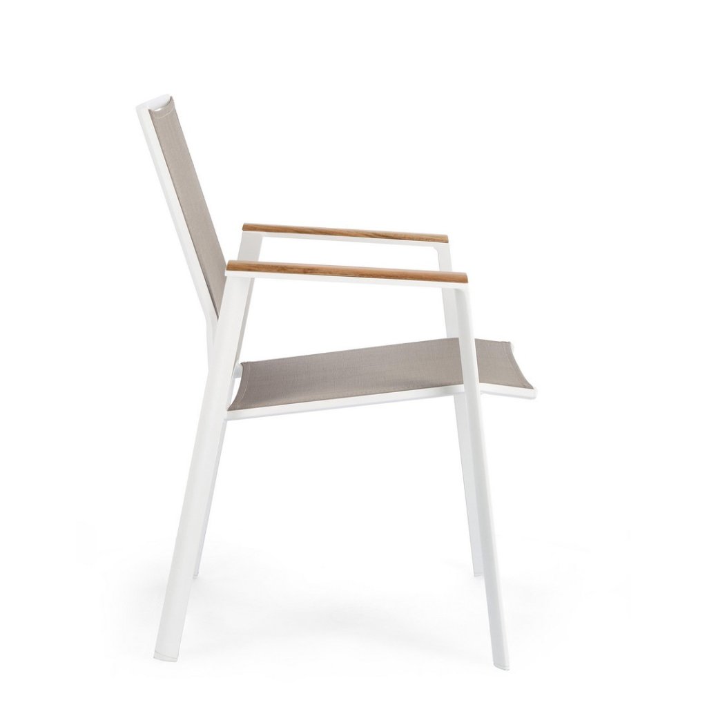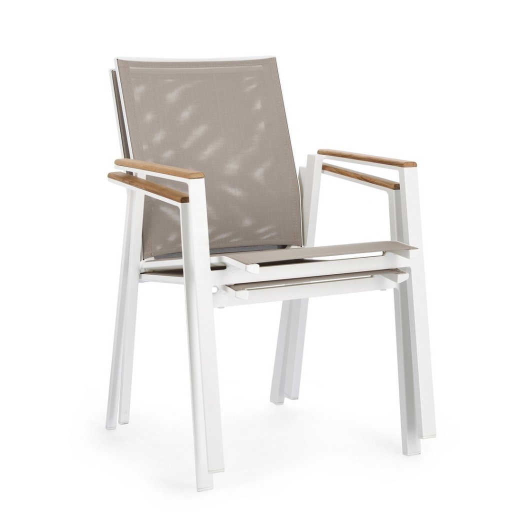 Dizajnové vonkajšie stoličky s opierkami CAMERON od talianskej spoločnosti štýlového nábytku BIZZOTTO. CAMERON tvorí pevný rám z hliníka, stolička je vďaka tomu veľmi ľahká. Sedadlo a opierka sú z umelé textílie. Na područkách je teakové drevo. Môžete ich zložiť až 2 stoličky.