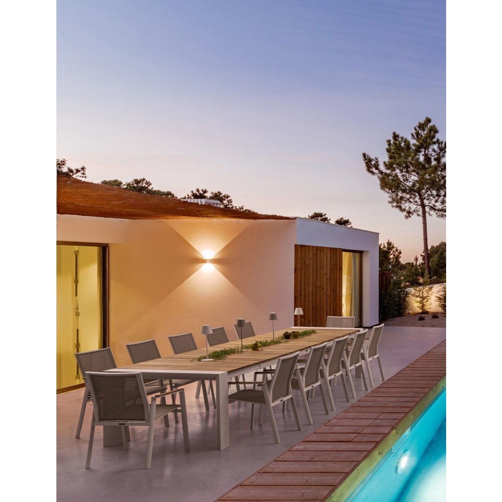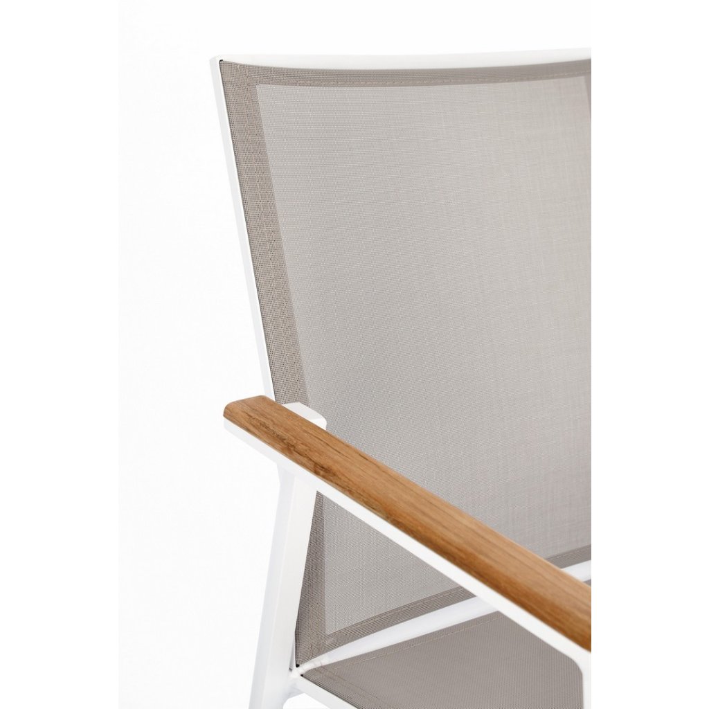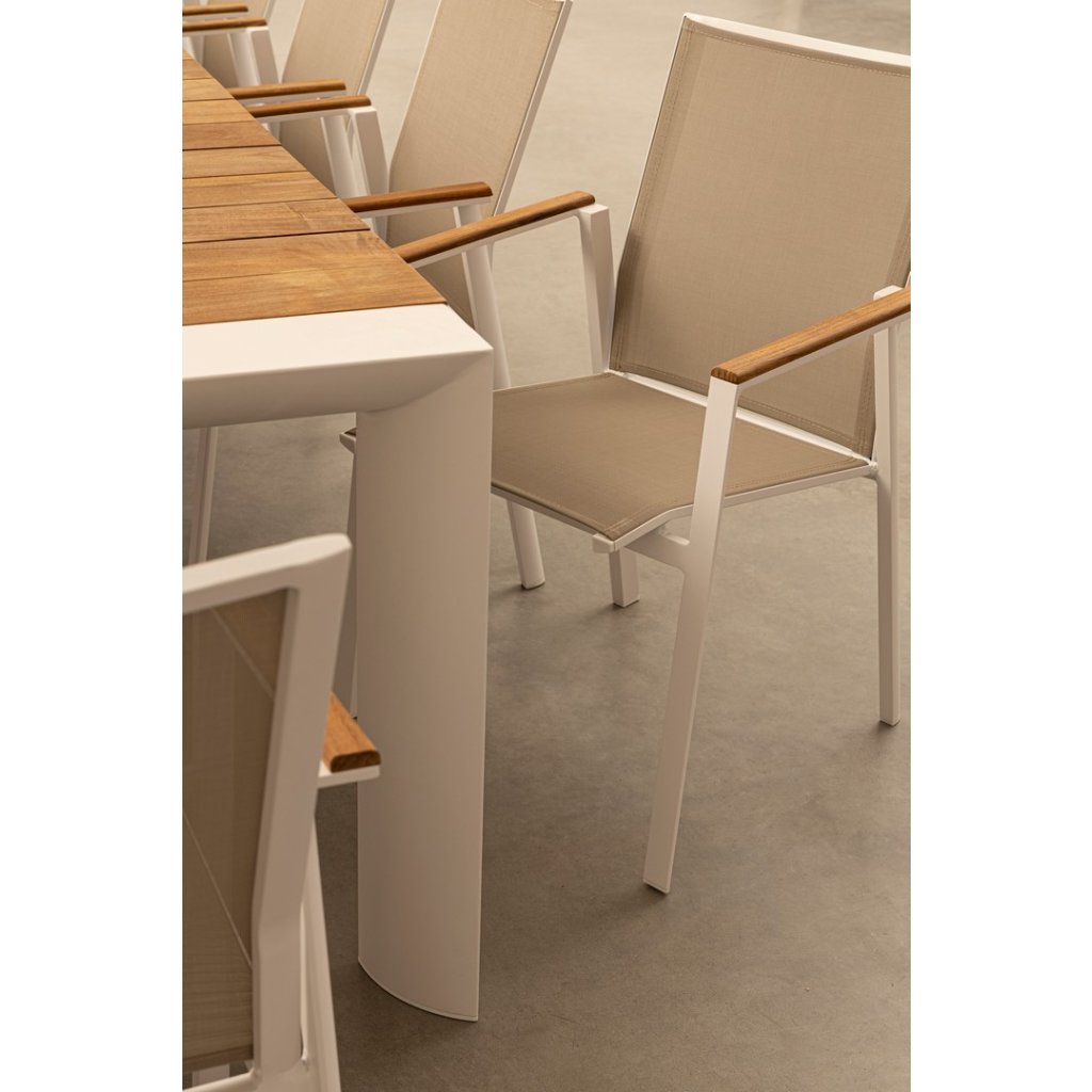 Dizajnové vonkajšie stoličky s opierkami CAMERON od talianskej spoločnosti štýlového nábytku BIZZOTTO. CAMERON tvorí pevný rám z hliníka, stolička je vďaka tomu veľmi ľahká. Sedadlo a opierka sú z umelé textílie. Na područkách je teakové drevo. Môžete ich zložiť až 2 stoličky.