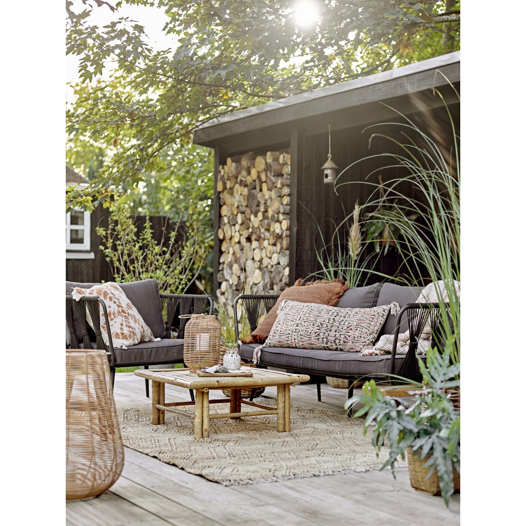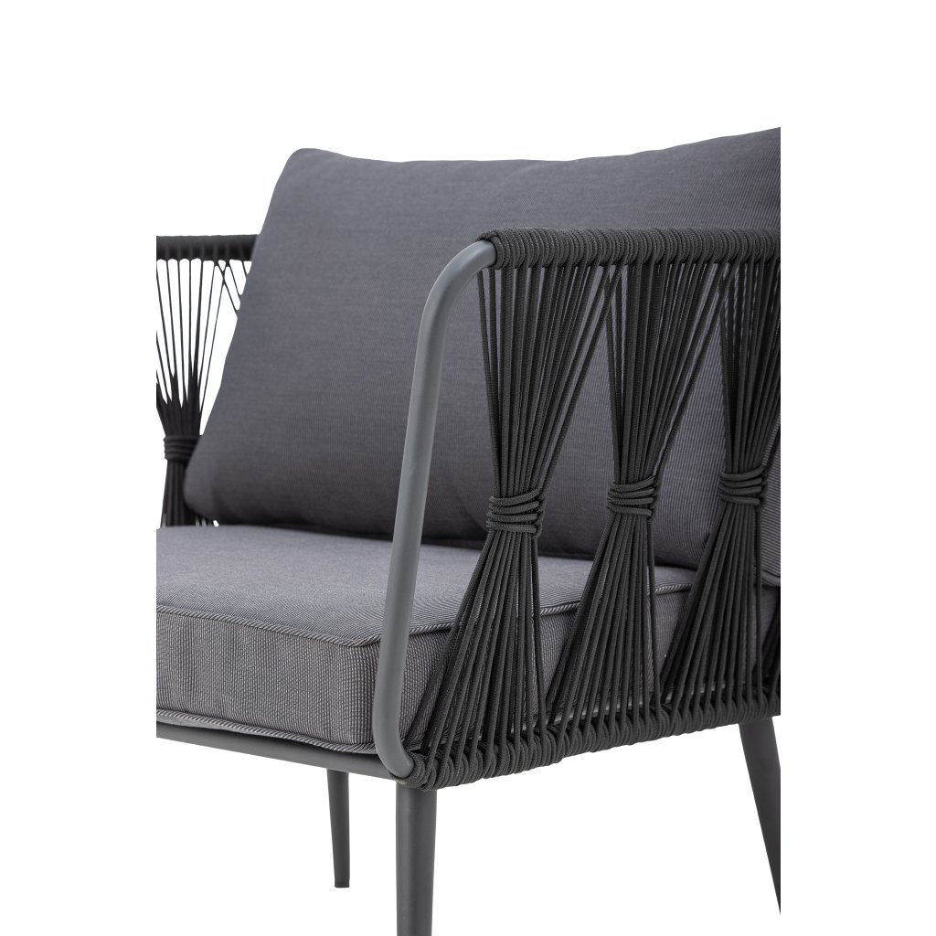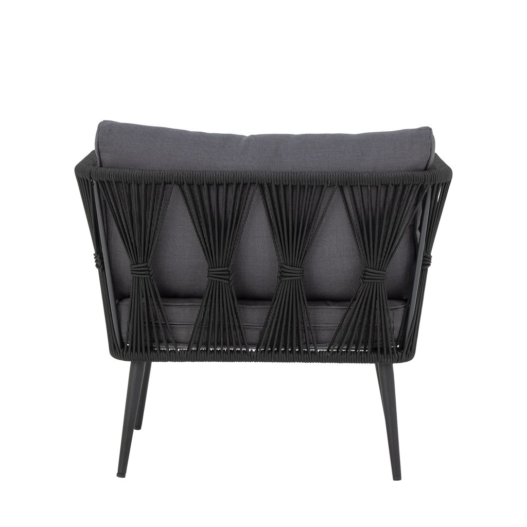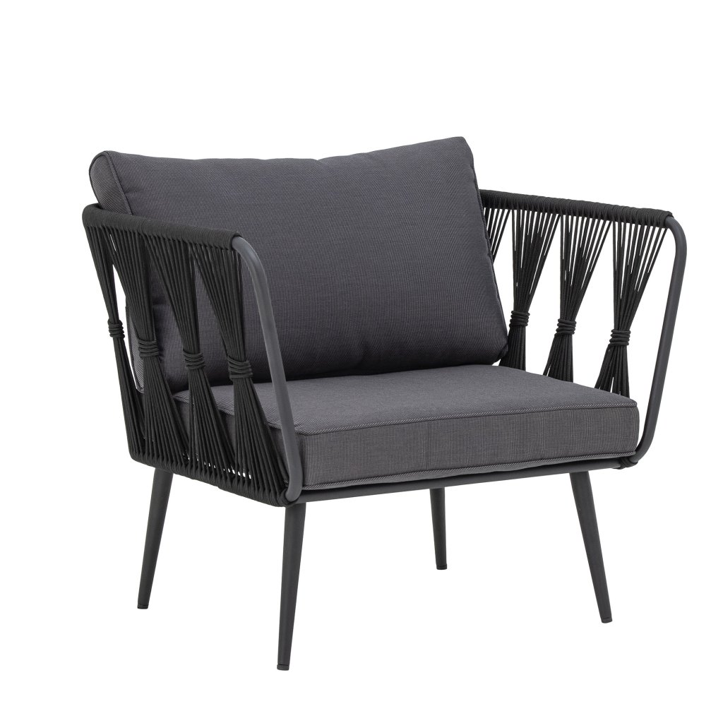 Dizajnové záhradné kreslo PAVONE od dánskej značky nádherného nábytku BLOOMINGVILLE. PAVONE je parádne kreslo z veľkej série záhradného nábytku, ktoré má konštrukciu z práškového lakovaného kovu, vďaka čomu je pevné, odolné a robustné. Vrchní sedací plocha je potom tvorená ručne sukovaným čiernym textilným lanom, ktoré je vodoodpudivé. Príjemné sedenie zabezpečuje polštářky v tmavo šedej farbe, ktoré môžete jednoducho vyprať do 30C.